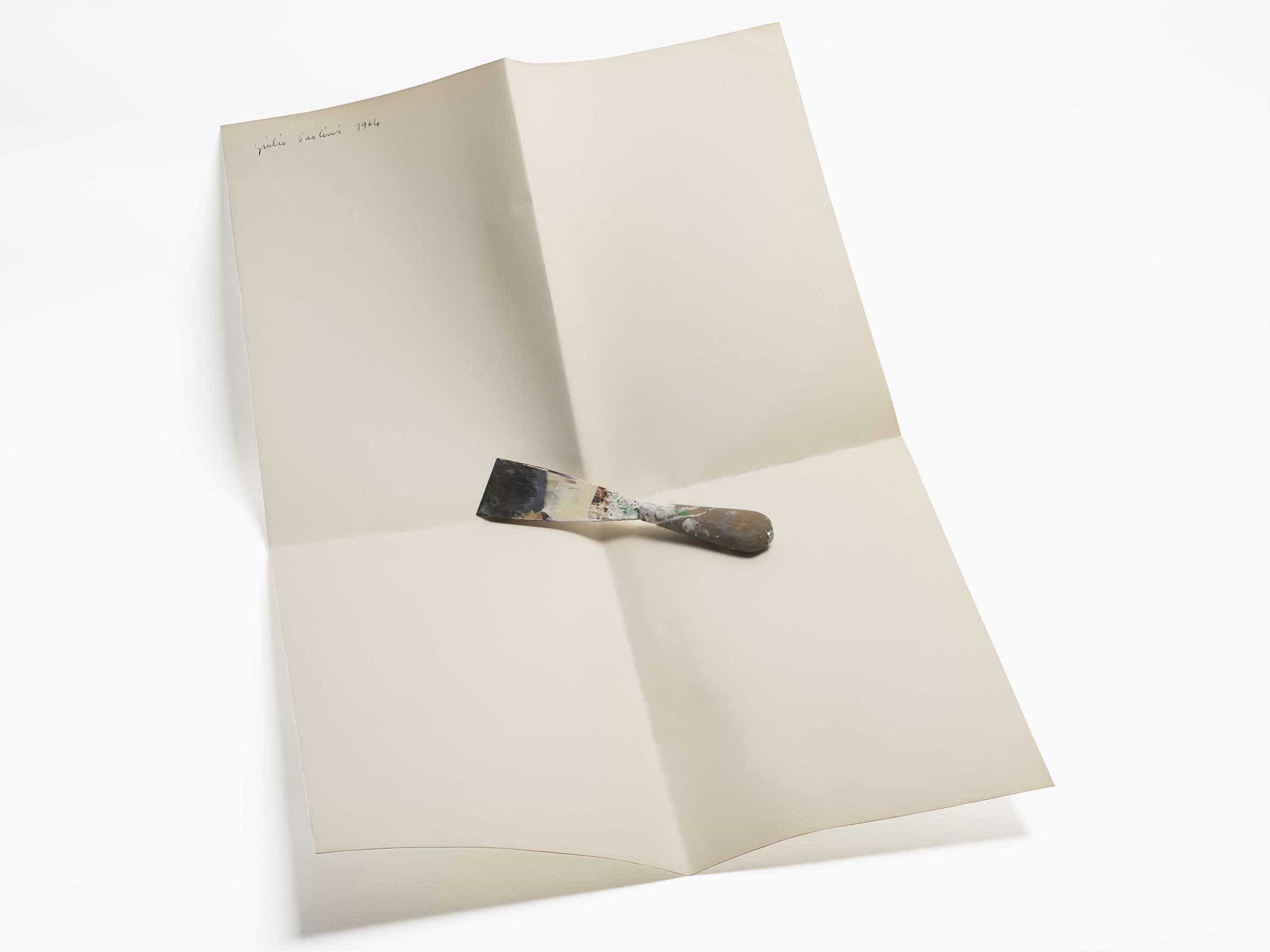 Un foglio da disegno, firmato e datato in alto a sinistra e piegato in quattro, contiene una spatola sporca di colore (in maniera analoga ad altri esempi con strumenti di lavoro, cfr. GPC-0029, GPC-0031, GPC-0032).