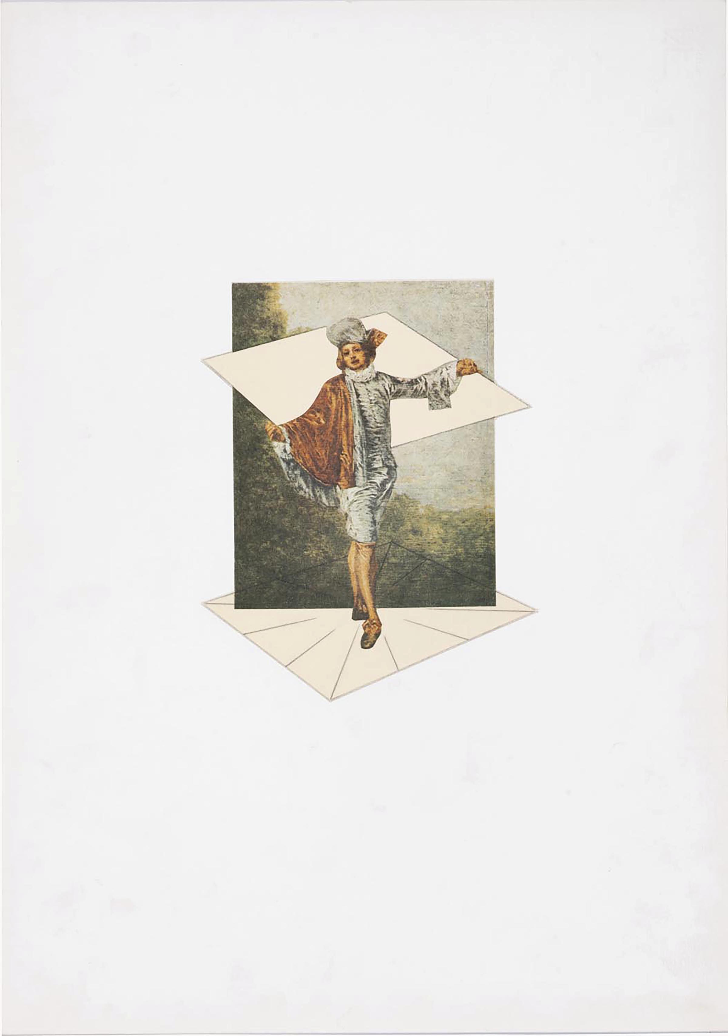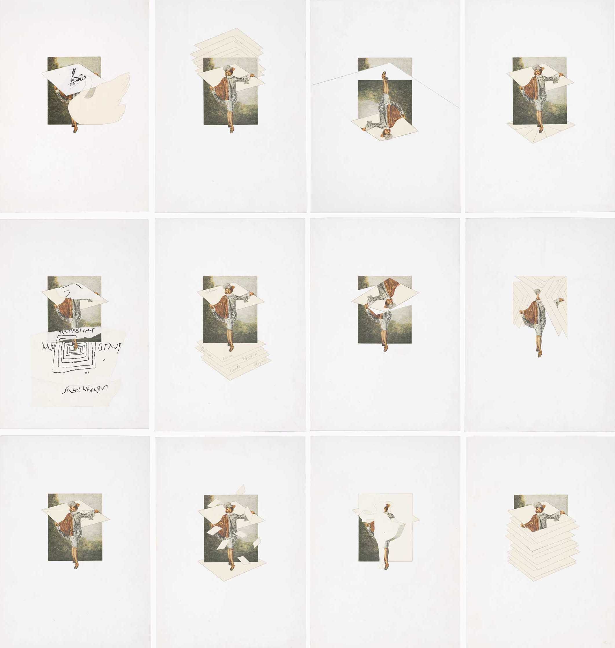 I dodici fogli hanno quale protagonista la figura maschile ripresa dal dipinto di Jean-Antoine Watteau intitolato L’Indifférent (1717), associato a uno o più quadrilateri bianchi. Ciascuna tavola richiama inoltre, attraverso una citazione iconografica o un particolare compositivo, un’opera precedente dell’artista.
