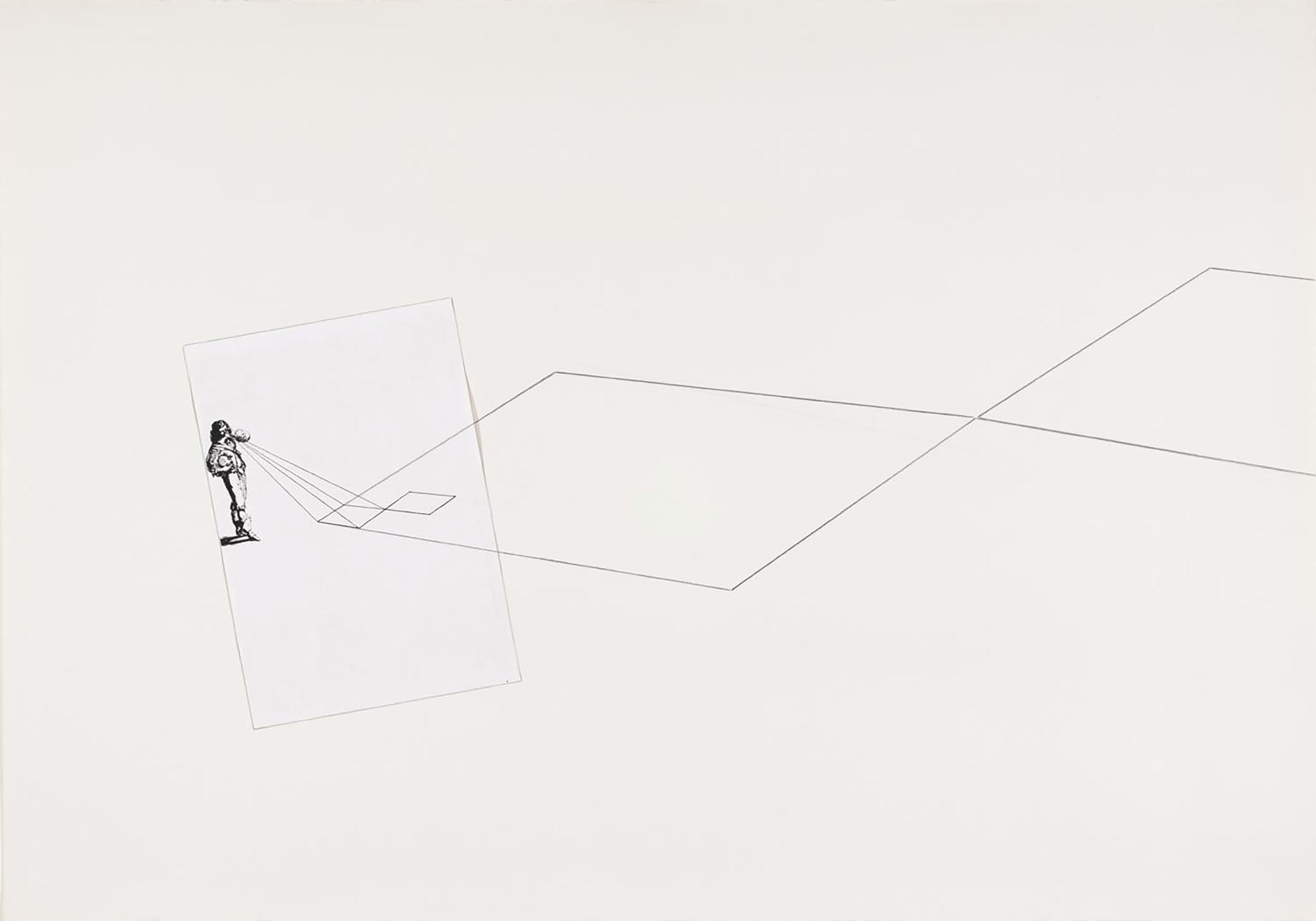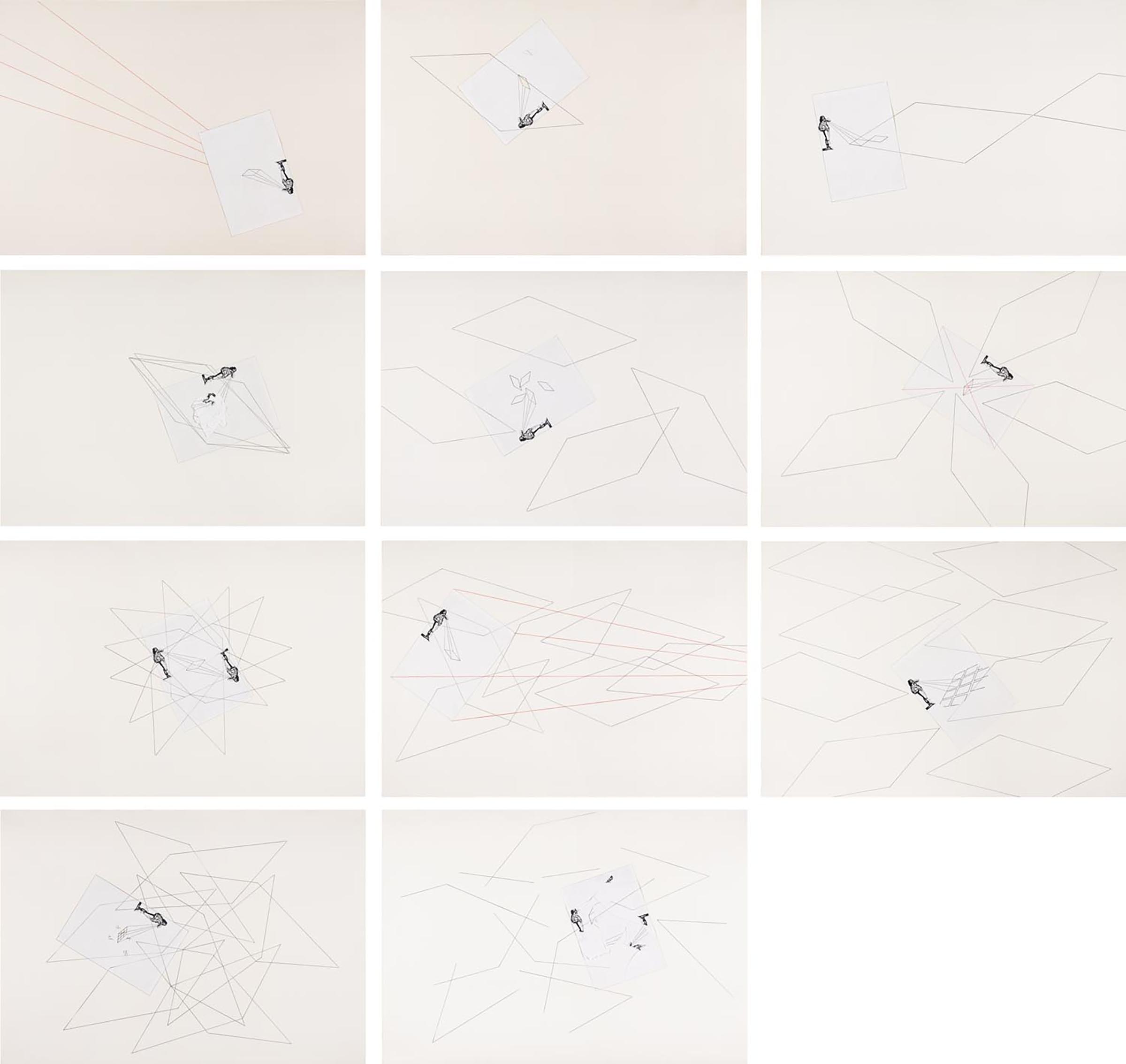 Comune denominatore tra gli undici studi, ideati insieme al lavoro di grande formato dallo stesso titolo (GPO-0442), è la presenza di una figura seicentesca, con una costruzione prospettica che si diparte dal suo sguardo. Da uno Studio all'altro lo sguardo del personaggio viene associato a un numero crescente di quadrangoli (da 1 a 11), che trovano corrispondenza nelle undici tele dell’installazione. I quadrilateri – deformati in trapezi in conformità alla visione in prospettiva – si sovrappongono fra loro e intersecano i fasci visuali della figura. Le rette corrispondenti ai fasci visuali, oppure alle diagonali che squadrano il rettangolo che inscrive il disegno della figura, sono tracciate a matita rossa.