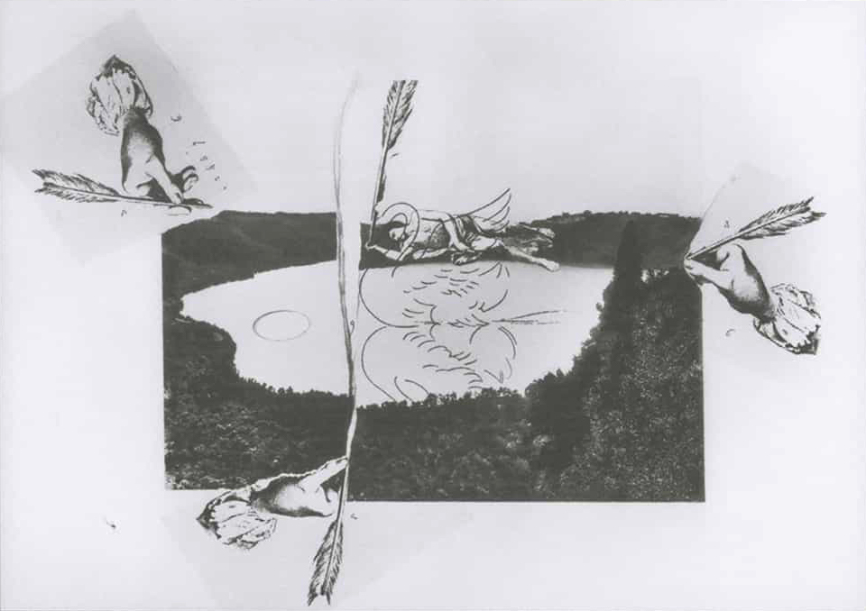 Alla mano di Narciso, coricato sul lago-tavolozza, e nel contempo al becco del cigno, delineato con il suo riflesso sullo specchio d’acqua, è associata una piuma-penna, affiancata da un lungo strappo verticale nel foglio che evoca anch’esso una piuma.