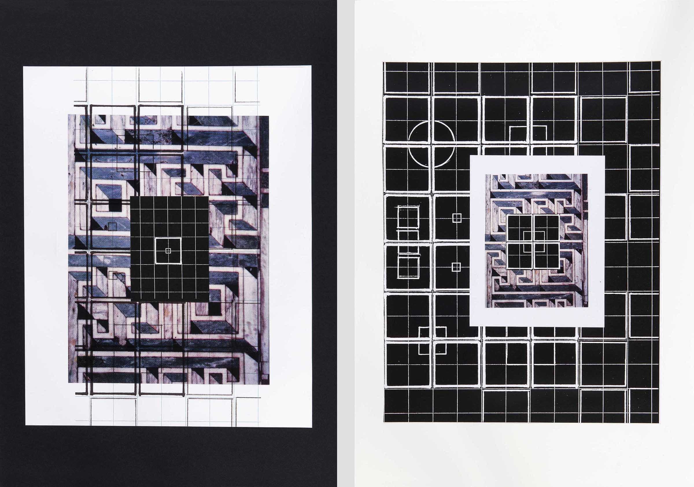 Riproduzione su acetato e collage su carta bianca e su carta nera