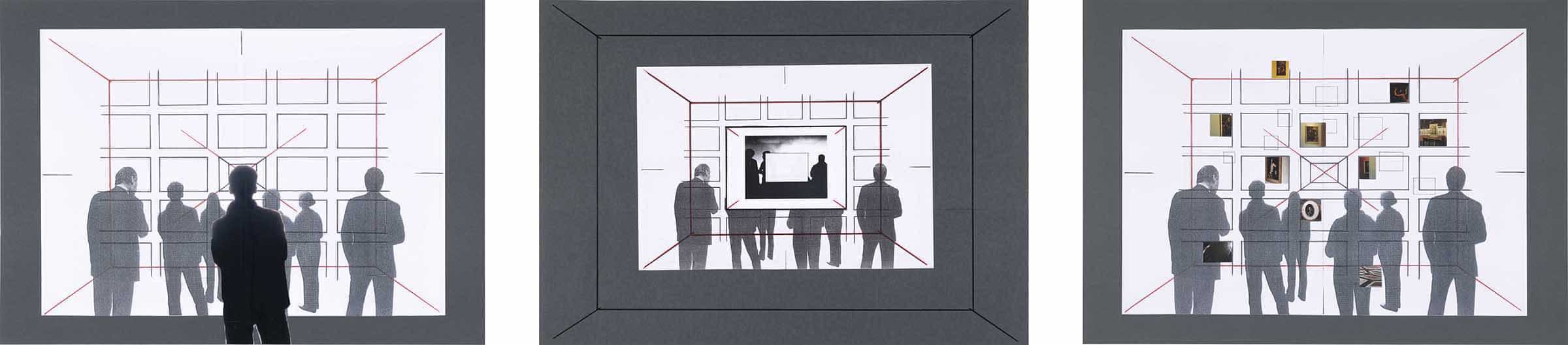Matita, inchiostro rosso, inchiostro nero e collage su riproduzione fotostatica e su carta grigia