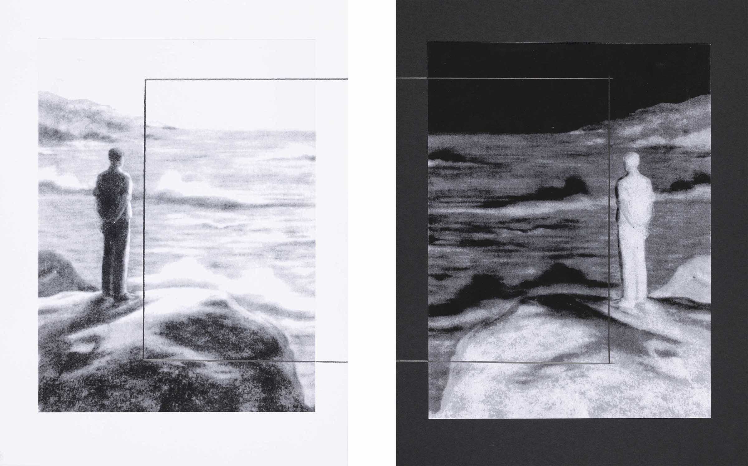 L’artista ha tracciato la metà di un riquadro lineare su ciascuna riproduzione fotostatica, in modo che nell’accostamento intervallato dei due elementi venga a comporsi l’inquadratura, interrotta, di un “quadro”. Le due immagini corrispondono allo stesso originale, riprodotto in positivo (a sinistra) e in negativo (a destra) e riflesso orizzontalmente da un foglio all’altro.