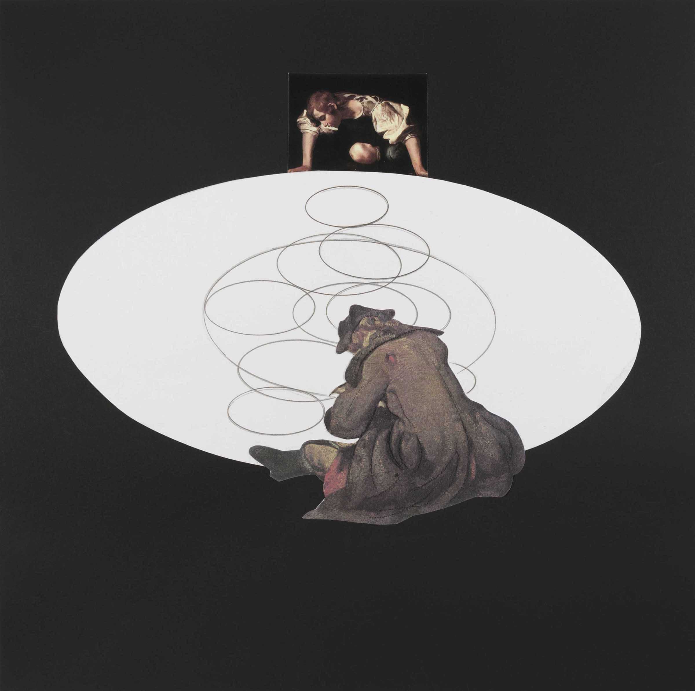 La superficie ovale bianca, inserita su uno sfondo nero, funge da specchio d’acqua per il Narciso di Caravaggio, che sembra rispecchiarsi in essa. Nello stesso tempo costituisce il “piano di lavoro” del disegnatore settecentesco raffigurato di spalle, intento a tracciare l’arabesco di cerchi che paiono formarsi sul pelo dell’acqua.