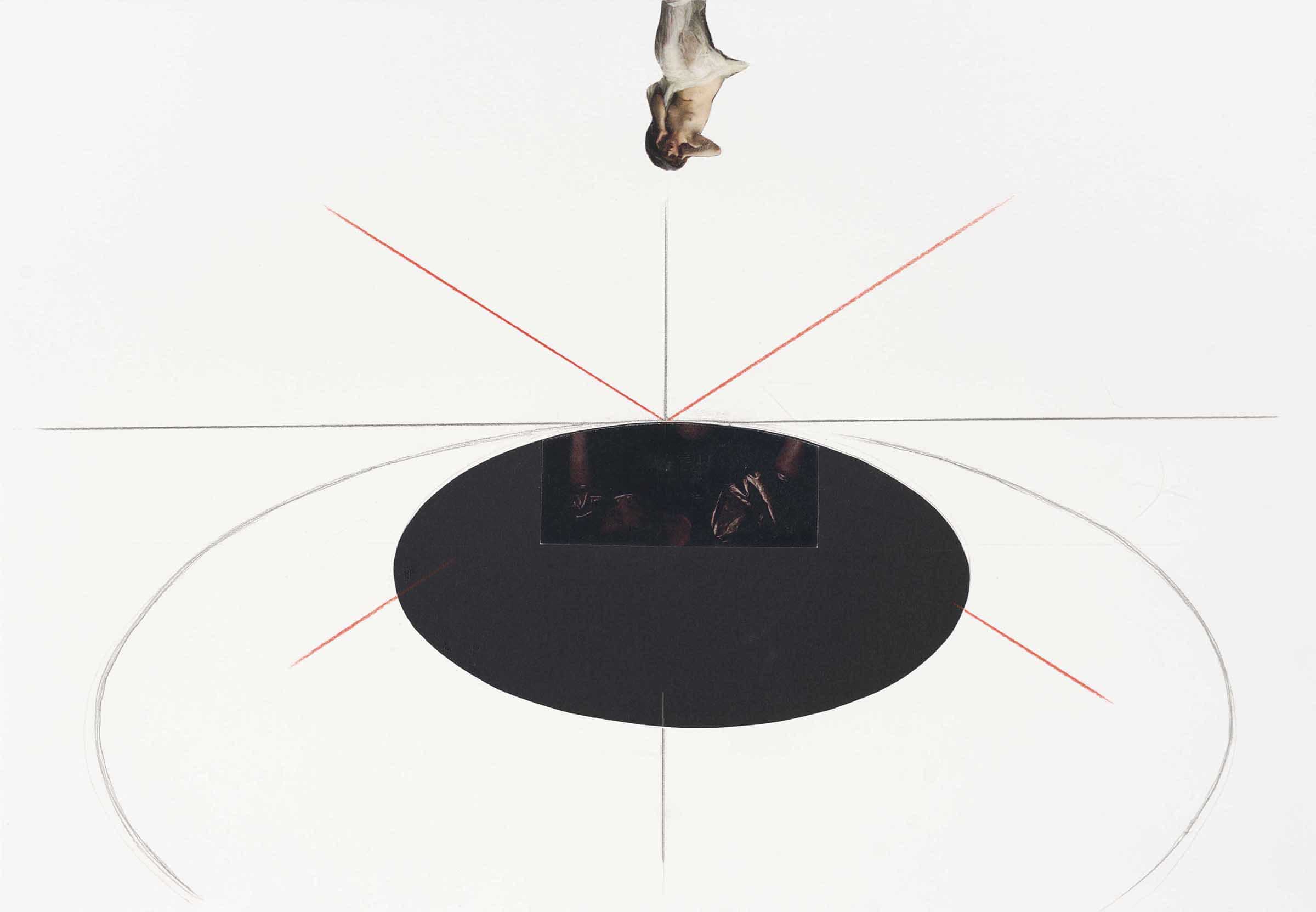 La figura scontornata della ninfa Eco è sospesa capovolta sopra il riflesso di Narciso nell’acqua, amplificato dai cerchi concentrici evocati a matita. L’incrocio delle diagonali rosse e degli assi ortogonali – con la verticale che pone in risalto la caduta di Eco – squadra la superficie del foglio da disegno e al tempo stesso richiama la squadratura di Disegno geometrico (1960), il primo quadro di Paolini, nonché matrice concettuale della sua poetica.