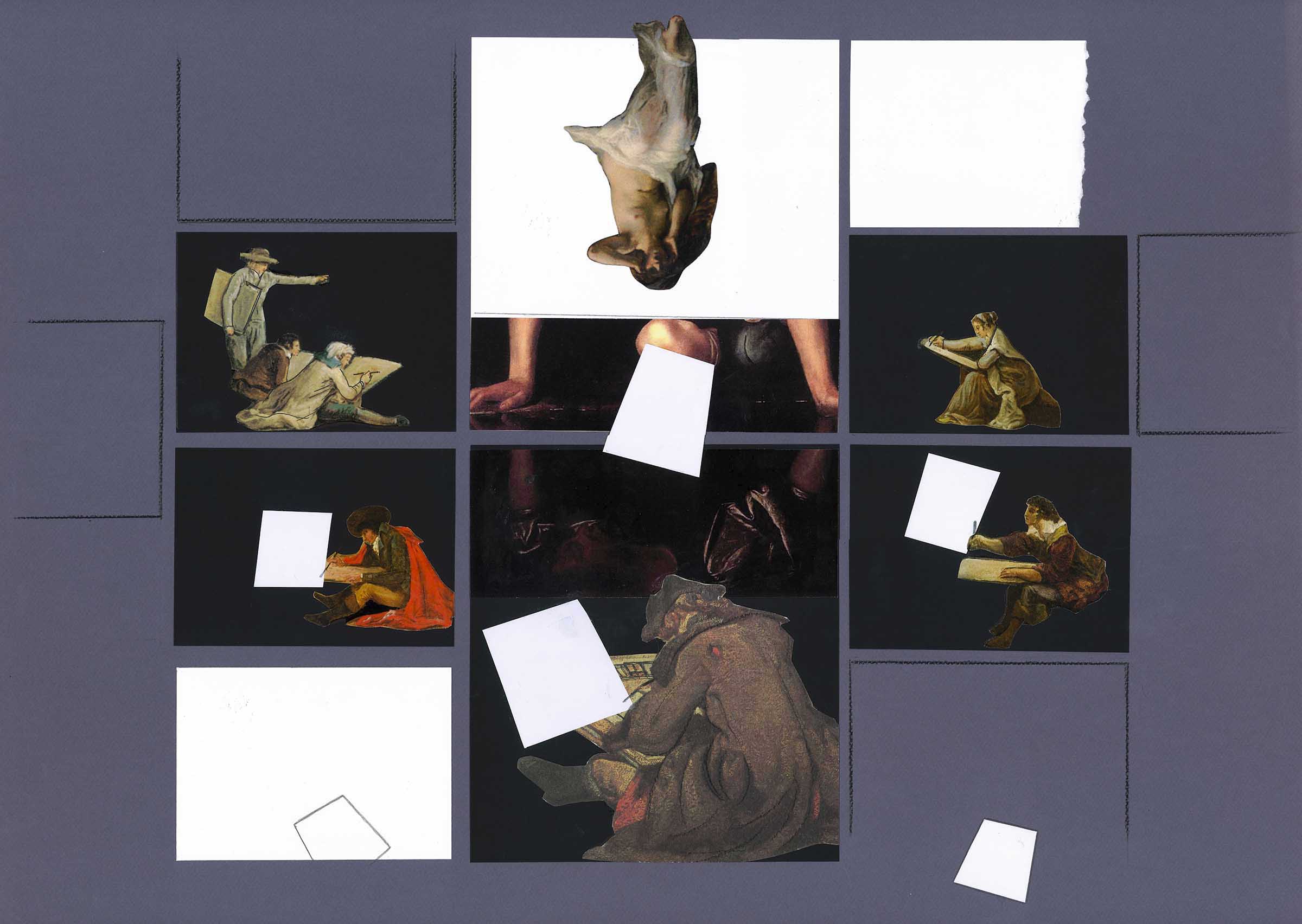 La figura scontornata della ninfa Eco, capovolta in alto al centro, si sovrappone all’immagine del Narciso di Caravaggio che si riflette in uno specchio d’acqua. Tutt’intorno alcuni pittori e disegnatori – figure tratte da dipinti di Hubert Robert et Jean-Baptiste-Siméon Chardin – sono intenti a fissare l’episodio fatale in una rappresentazione, destinata però a disperdersi nel vuoto come suggeriscono i riquadri-fogli bianchi, anch’essi in caduta libera.