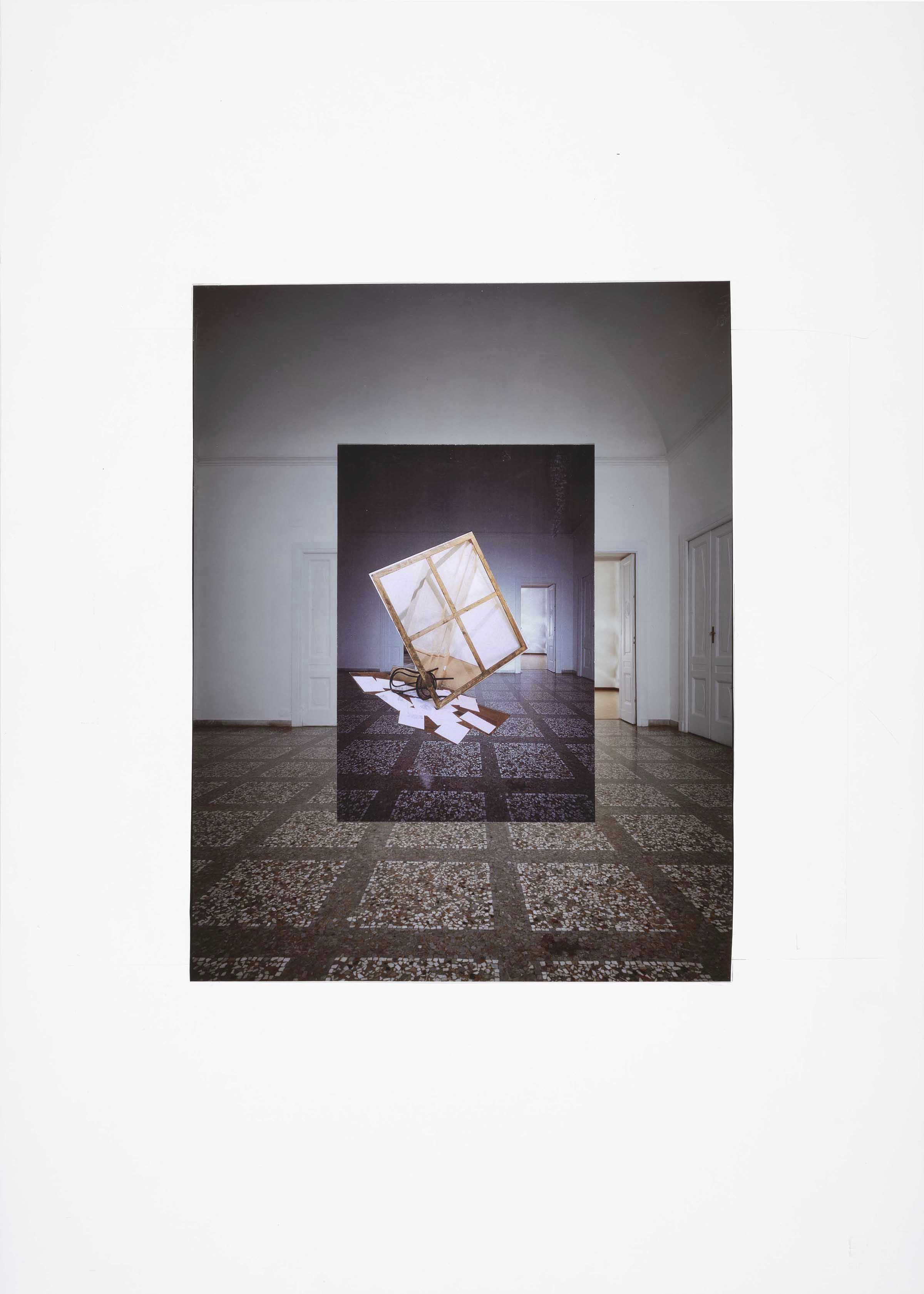 Sullo sfondo fotografico dell'atrio d'ingresso dell'abitazione dell'artista si staglia una seconda immagine, più piccola, dello stesso ambiente, che accoglie una riproduzione fotografica dell'opera di grande formato Piazze d'Italia (II), 2001 (GPO-0866).