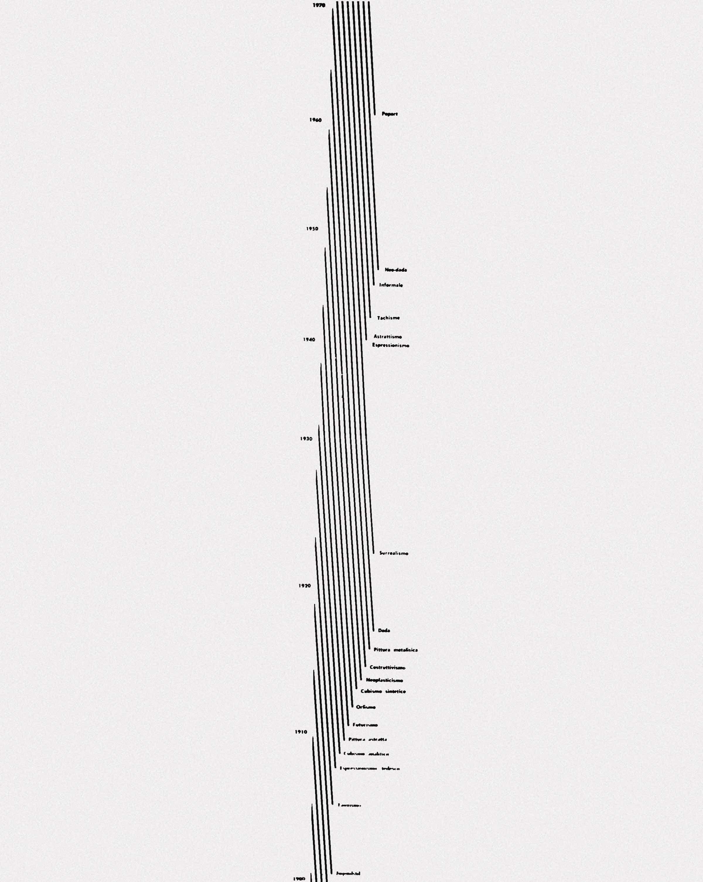 La fotografia riproduce un diagramma lineare che rappresenta l’indice di durata delle correnti d’avanguardia dall’inizio del XX secolo fino agli anni Sessanta, a partire dal 1900 e dallo “Jugendstil”, in basso, fino ad arrivare, in alto, al 1970 e alla “Popart” [sic], l’ultima tendenza citata in corrispondenza dei primi anni Sessanta. Il titolo riferisce il numero di pagina del libro da cui Paolini ha tratto l’immagine, in particolare la parte del diagramma relativa agli sviluppi più recenti1.