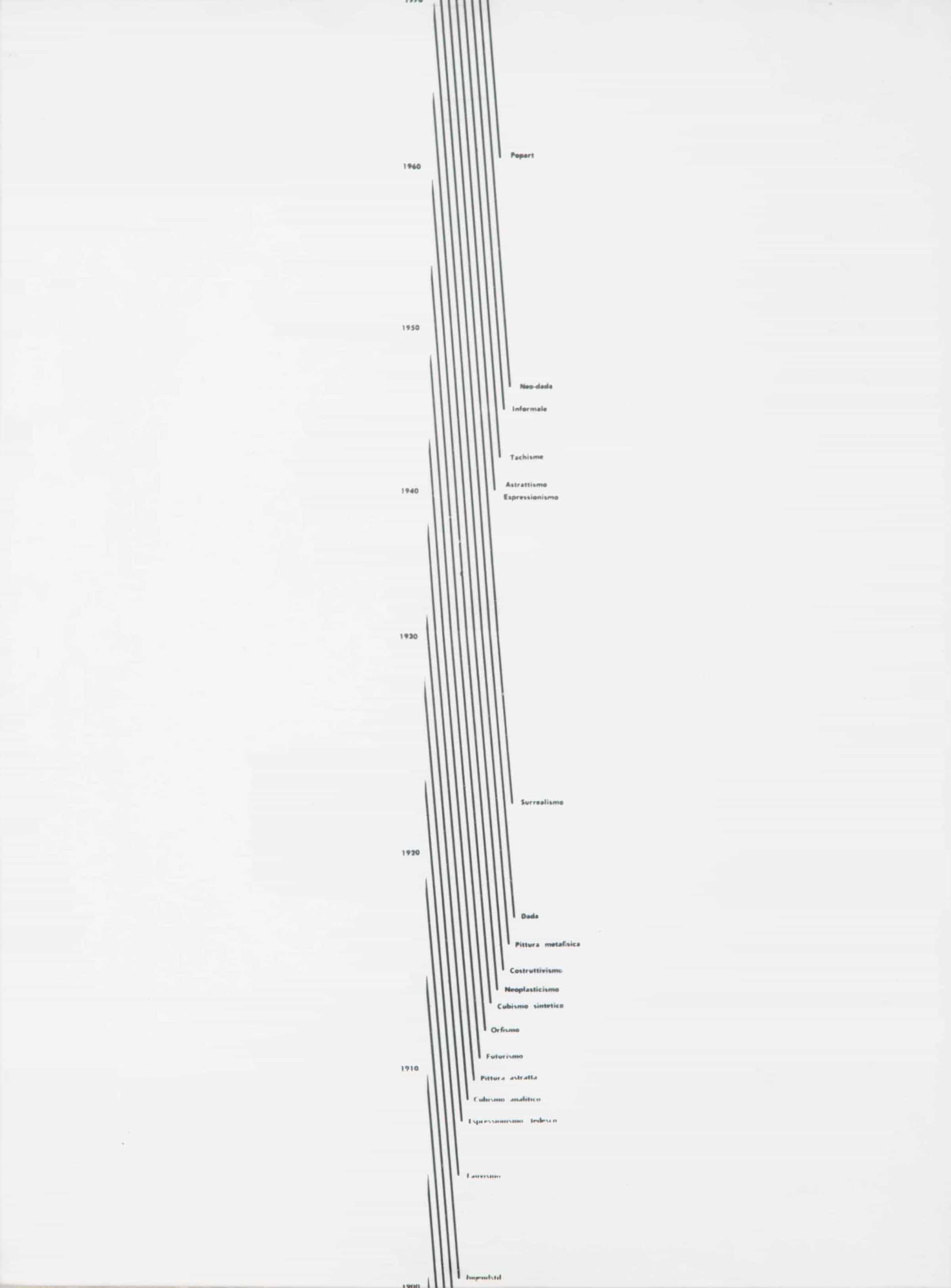 La fotografia riproduce un diagramma lineare che rappresenta l’indice di durata delle correnti d’avanguardia dall’inizio del XX secolo fino agli anni Sessanta, a partire dal 1900 e dallo “Jugendstil”, in basso, fino ad arrivare, in alto, al 1970 e alla “Popart” [sic], l’ultima tendenza citata in corrispondenza dei primi anni Sessanta. Il titolo riferisce il numero di pagina del libro da cui Paolini ha tratto l’immagine, in particolare la parte del diagramma relativa agli sviluppi più recenti1.