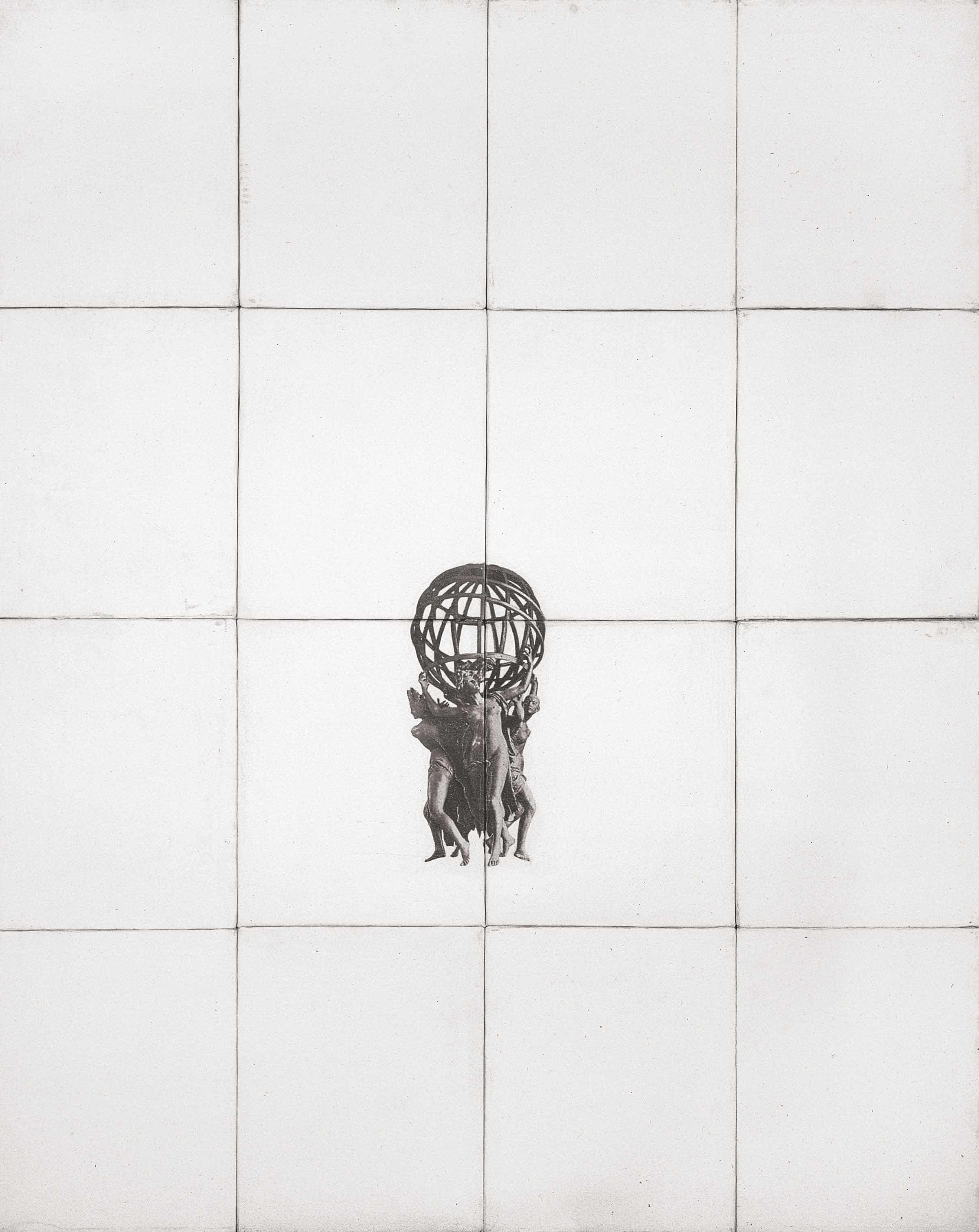 Quattro tele fotografiche, incorniciate da dodici tele preparate, riproducono l’immagine scontornata del gruppo scultoreo di Jean-Baptiste Carpeaux intitolato Les quatres parties du monde soutenant la sphère céleste (1872 ca.), in modo che il centro del quadro spartisca letteralmente in quattro parti il globo retto dalle figure allegoriche.