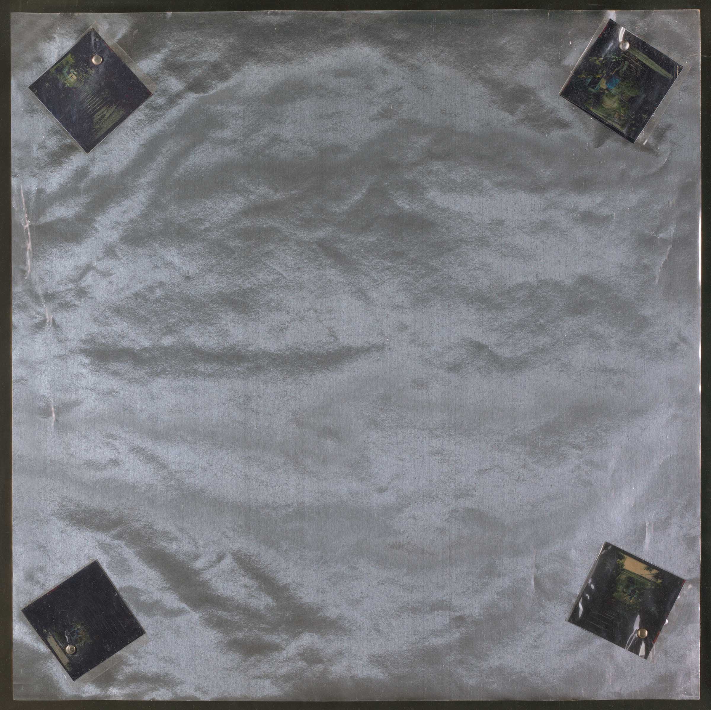 Quattro negativi fotografici sono fissati ciascuno con una puntina da disegno nei quattro angoli di un foglio di carta argentata, fermato su un telaio, alla maniera di souvenir trattenuti nella cornice di uno specchio.