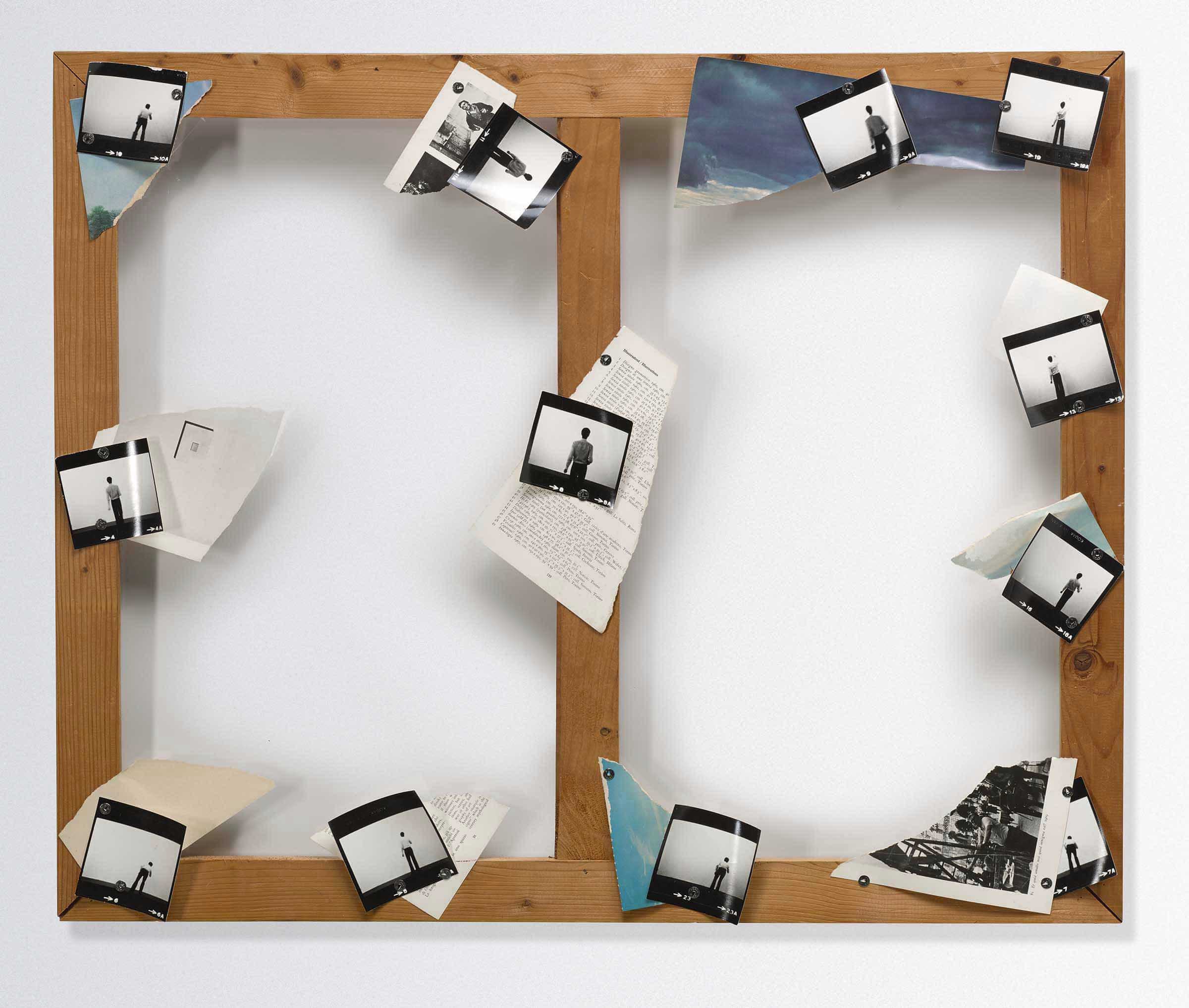 Copie a contatto di fotografie, pagine di libro e frammenti di riproduzioni fotografiche appuntati su telaio con puntine da disegno