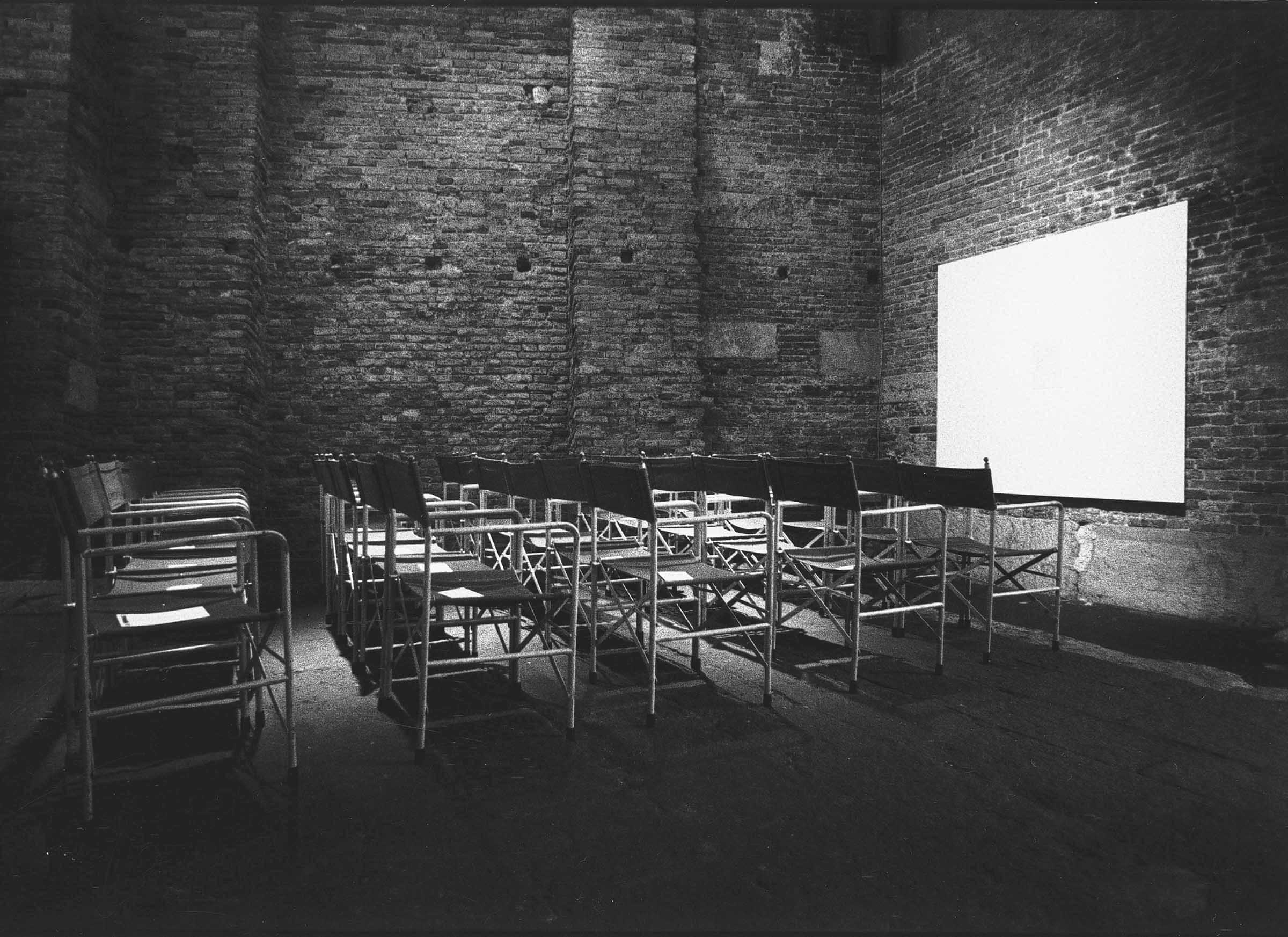 L’intervento prevedeva un assieme di trenta sedie (pari al numero degli artisti partecipanti) riunite in un ambiente interno a formare una "platea", orientata verso uno schermo che recava al centro il seguente testo dell’artista: "Il progetto prevede che l'attuale domanda sull'uso dell'edificio non possa trovare una risposta definitiva e che lo spazio in questione viva questa ricerca come suo perenne destino. La prima testimonianza di questa prospettiva di interpretazione è che il concorso in atto non può presumere di indicare altre proposte che non siano le tracce del suo stesso svolgimento. Il progetto comporta l'impiego di trenta sedie (del tipo cosiddetto da regista) ognuna contraddistinta dal nome dei singoli partecipanti o gruppi invitati, disposte isolatamente, per una durata indefinita, nei vari ambienti, all'esterno, sulla laguna circostante. Altri interventi, paralleli e successivi, potranno costituire la materia viva da cui il nuovo 'museo' trarrà continue interrogazioni sulla sua stessa esistenza nei termini di struttura e funzione.”