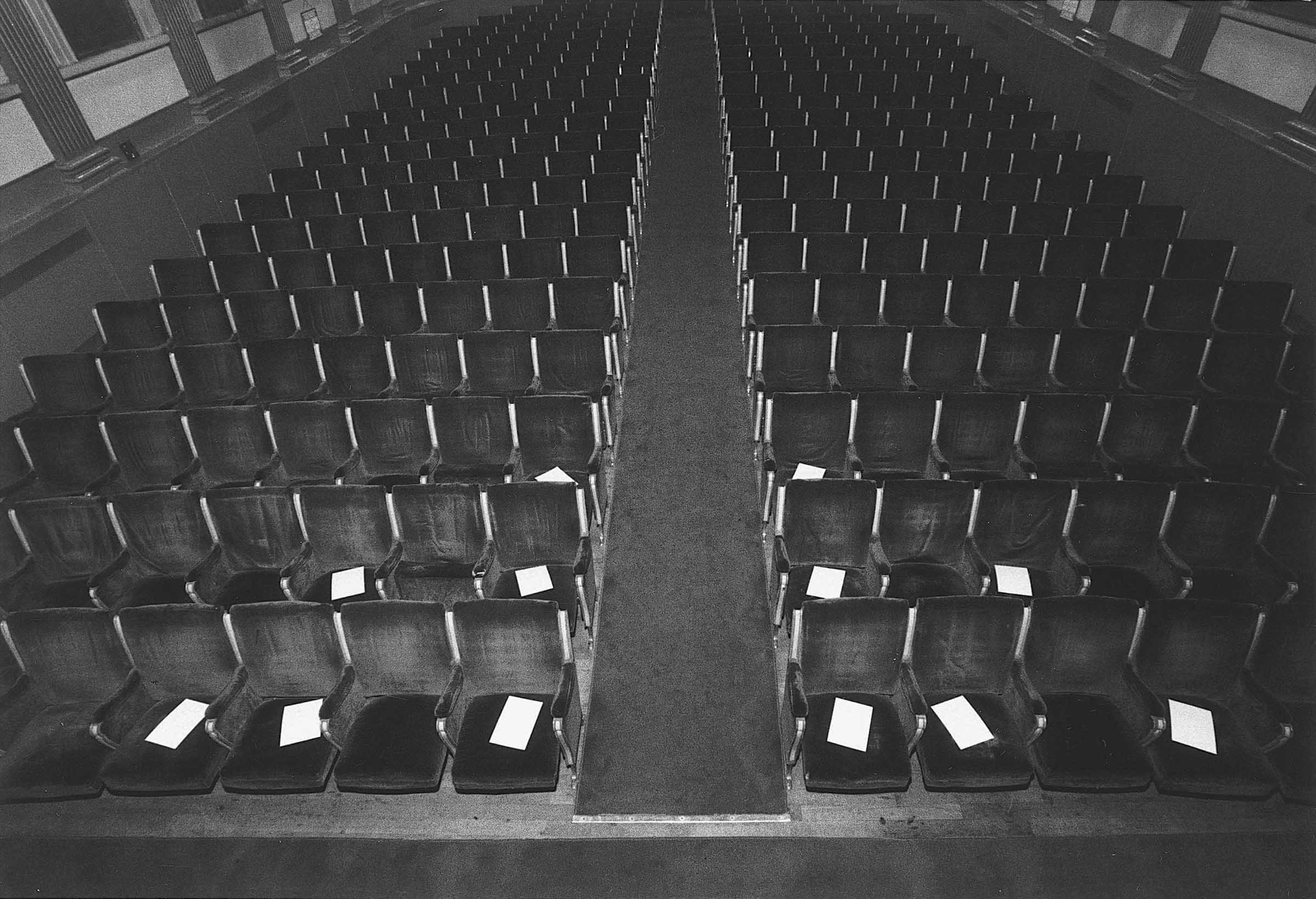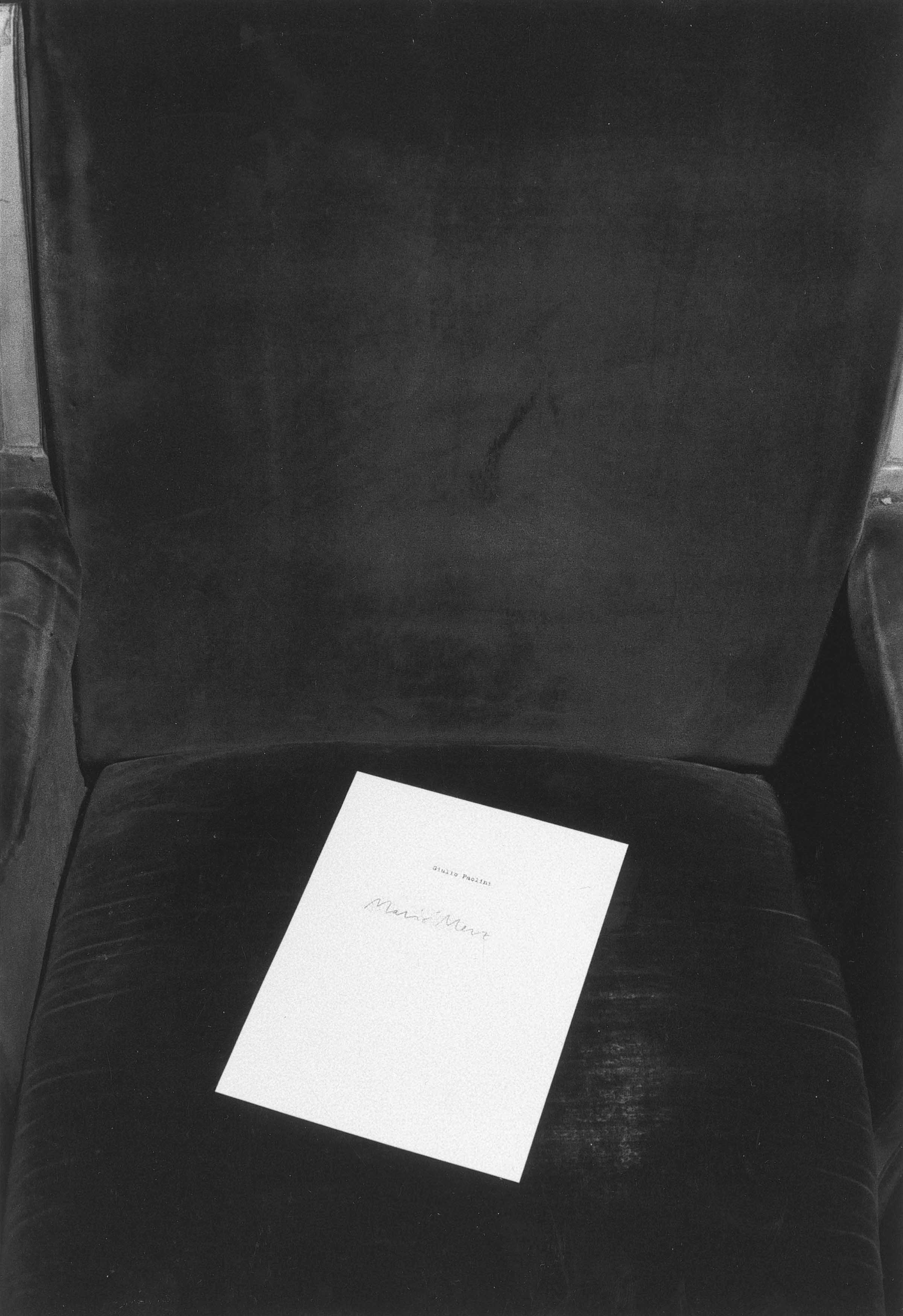 Per il suo intervento alla manifestazione artistica curata da Mirella Bandini al Teatro Gobetti di Torino il 3 maggio 1977, Paolini ha intestato a caratteri dattiloscritti dodici fogli di carta da lettere con i nomi dei quattro artisti partecipanti (tre fogli per ciascun artista): Marco Bagnoli, Mario Merz, Giulio Paolini e Remo Salvadori. In seguito ha invitato i colleghi a firmare di proprio pugno le relative pagine, con il nome però degli altri artisti, in modo che il nominativo di ciascuno risultasse "firmato" dalla calligrafia di un altro. Paolini ha poi distribuito i dodici fogli sulle poltroncine delle prime file della platea del teatro.