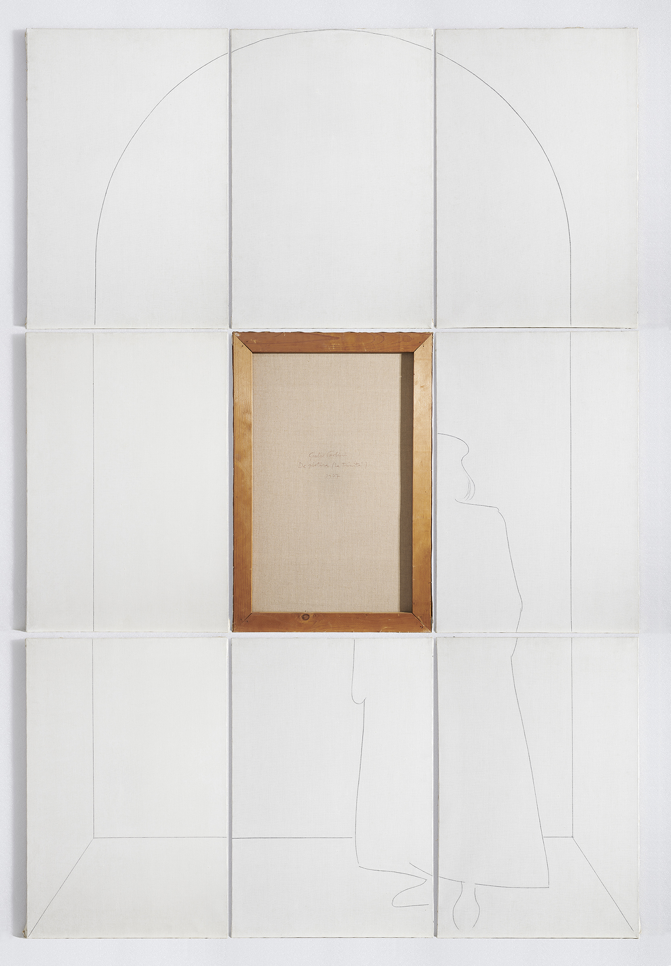 L’assieme delle nove tele propone il disegno di un ambiente in prospettiva, dove la tela rovesciata simula il verso di un quadro situato sulla quarta parete della stanza. La scena è abitata da una figura in costume, che sembra osservare il fronte del quadro precluso al nostro sguardo. L’attenzione sull’atto visivo rispecchia la nostra stessa presenza di fronte all’opera che stiamo osservando (come suggeriscono anche le iscrizioni autografe sulla tela rovesciata, che certificano sia il quadro osservato dal personaggio virtuale sia l’opera di fronte a noi).