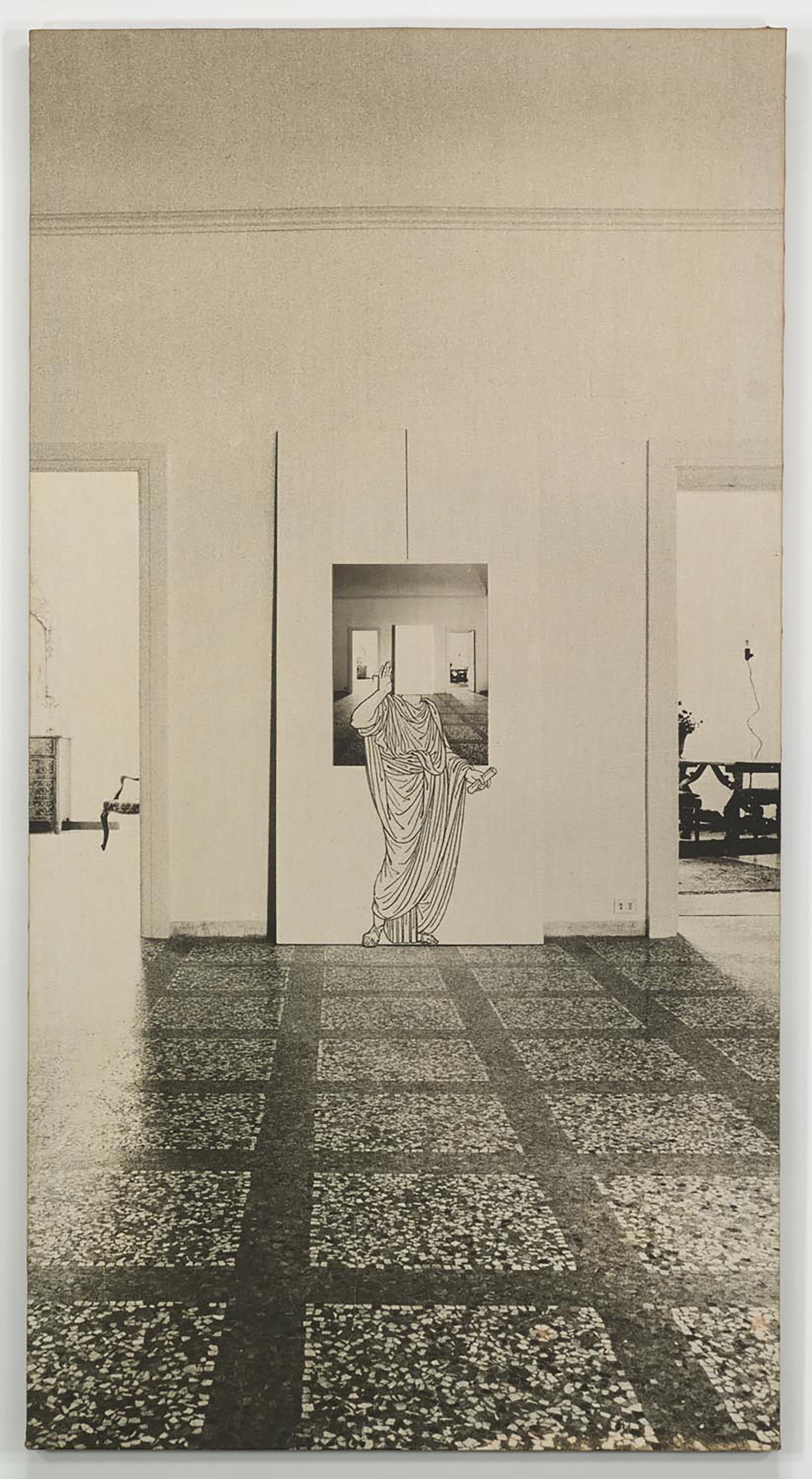 Il complesso fotomontaggio riproduce una veduta dell’atrio dell’abitazione dell’artista: sulla parete di fondo, tra due porte aperte, è appoggiato il Senza titolo del 1964 (GPO-0060), con una copia ridotta della medesima inquadratura fotografica che cade al centro, a simulare il quadro sospeso sul pannello. Al centro di questo (presunto) quadro, in corrispondenza del Senza titolo nella fotografia duplicata, cade un piccolo riquadro bianco, che nasconde lo sguardo della figura in costume rivolta verso di noi, la quale sembra guardare in trasparenza il quadro che a noi appare cieco.