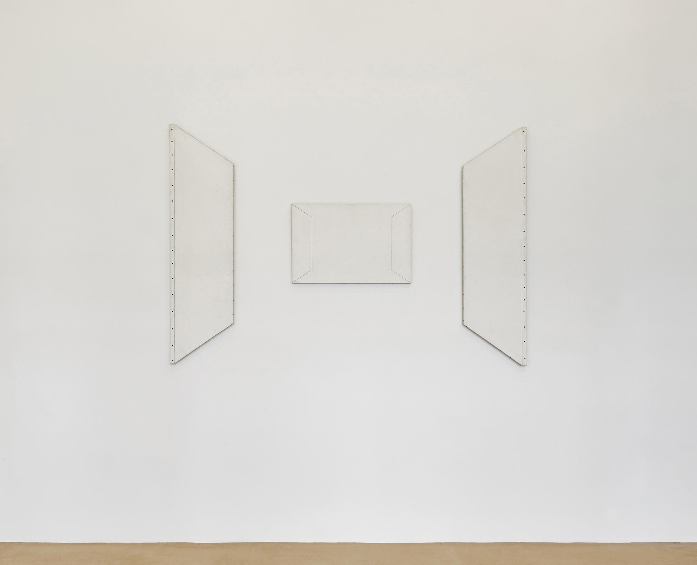 La fuga prospettica simulata da due tele di forma trapezoidale converge nella tela centrale, che reca disegnati altri due quadri visti in prospettiva. La simulazione prospettica è avvalorata dai chiodi e dallo spessore delineato a matita lungo un lato verticale delle tele trapezoidali.