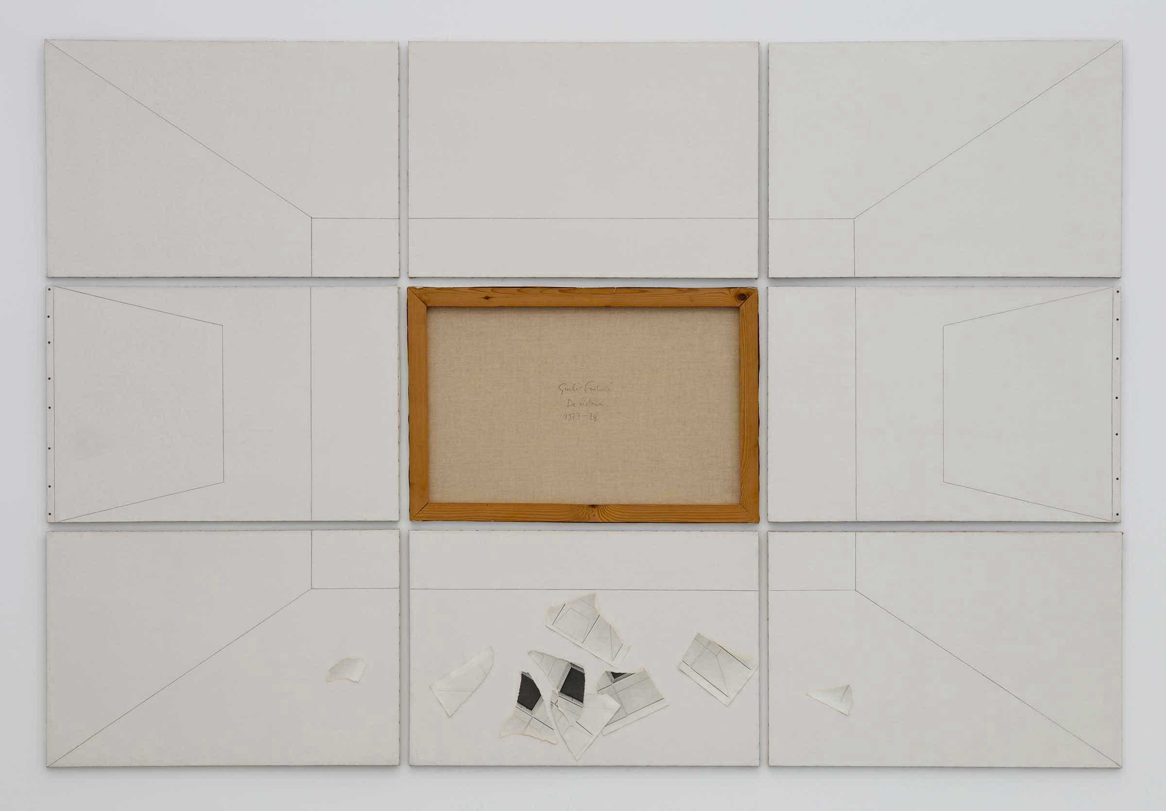 Nove elementi incorniciati e accostati a brevi intervalli riproducono il disegno in prospettiva di un ambiente espositivo. L’elemento centrale rovesciato evoca il verso del quadro esposto sul quarto lato di questa stanza, sulle cui pareti laterali si trovano altri due quadri, avvalorati nella loro verosimiglianza dalla presenza dei chiodi lungo il lato verticale esterno. Come la tela centrale rovesciata, così anche i chiodi riportano lo sguardo sul piano materiale che al tempo stesso apre e chiude lo spazio della rappresentazione, sulla soglia che divide lo spazio fisico al di qua della scena da quello inaccessibile situato oltre la superficie del quadro. La firma, il titolo e la data dell’opera iscritti sul verso della tela centrale certificano l'autenticità del quadro che sfugge al nostro sguardo e nello stesso tempo dell'opera che vediamo.