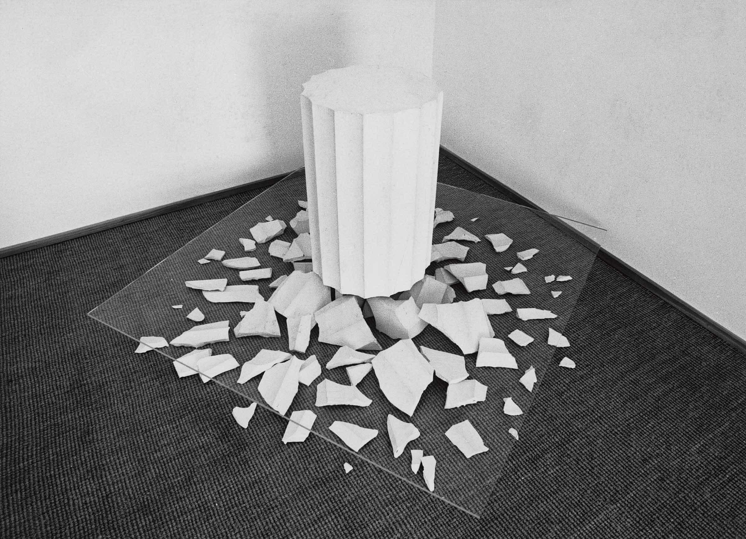 Il calco in gesso di una porzione di fusto di una colonna scanalata è posato al centro di una lastra in plexiglas, appoggiata in equilibrio precario sui frammenti di un secondo calco identico, deflagrato. Il titolo cita l’antica città greca di Selinunte, sulla costa sud occidentale della Sicilia, amplificando l’evocazione di rovine e di manufatti architettonici.