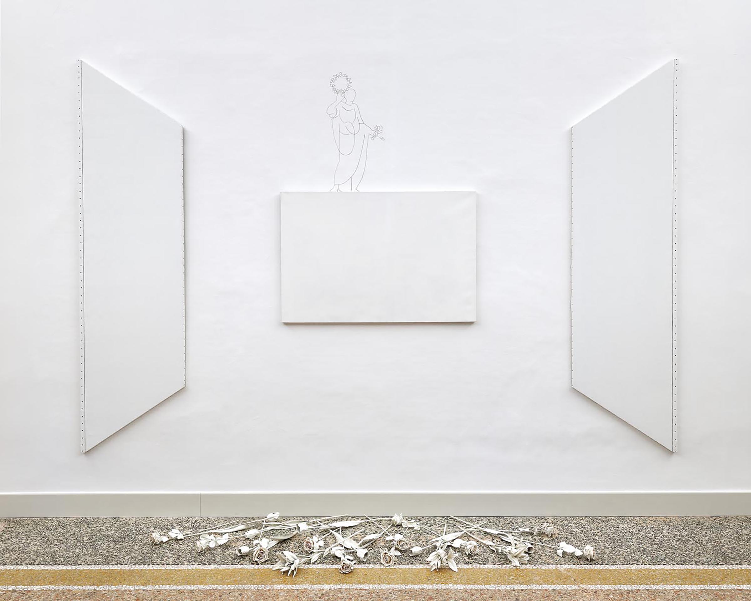 La fuga prospettica simulata da due tele di forma trapezoidale converge nella tela centrale, sormontata dal disegno di un personaggio in costume antico, che reca una corona d’alloro nella mano alzata e un fiore nell’altra. La simulazione prospettica è avvalorata dai chiodi e dallo spessore delineato a matita lungo un lato verticale delle tele trapezoidali. Davanti alla parete i fiori artificiali bianchi, sparsi come fossero rovinati a terra, fanno da contrappunto, al di qua dello spazio ideale della rappresentazione, a quello trattenuto dalla figura disegnata.