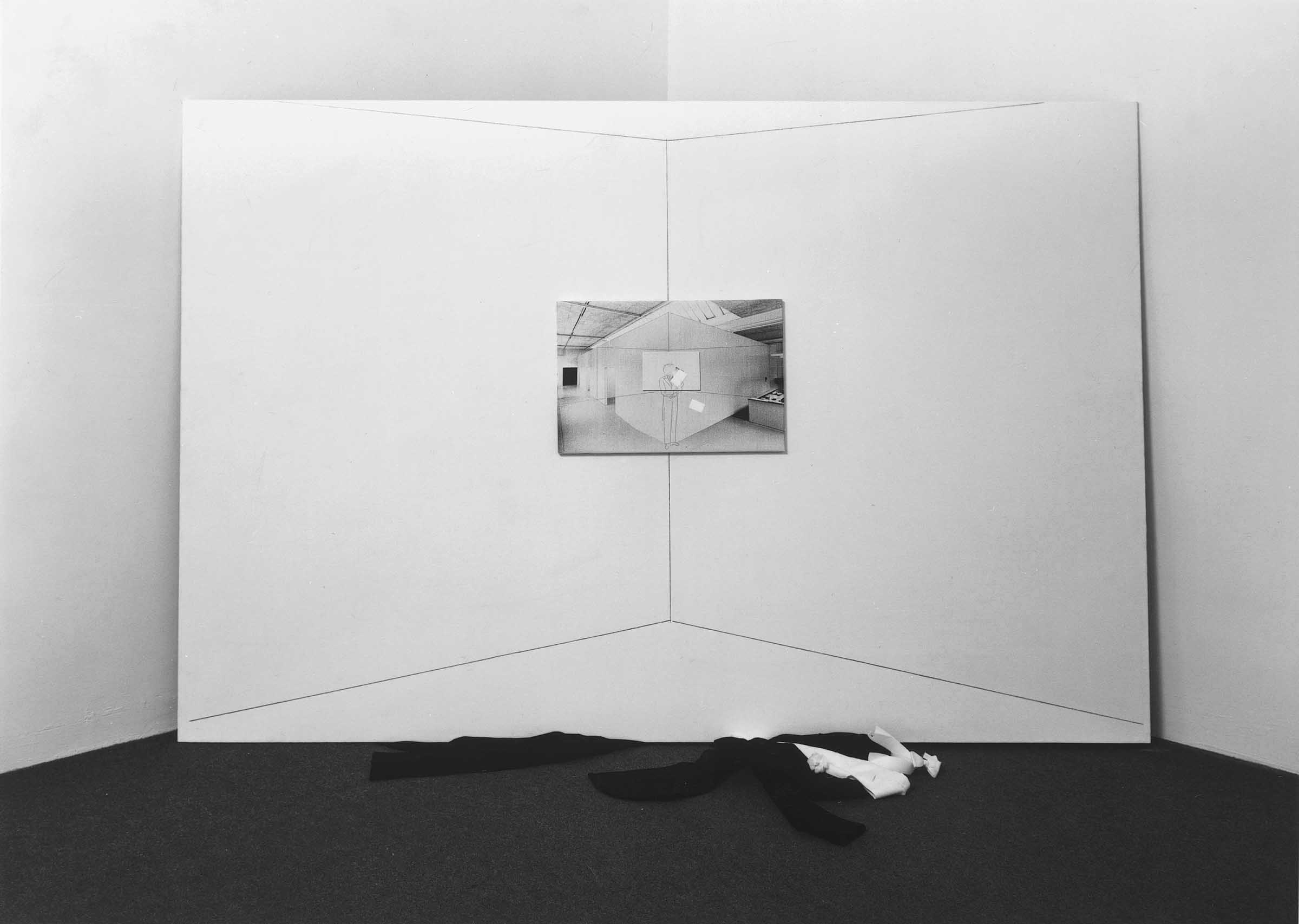 Una grande tela preparata riporta il disegno delle coordinate dell’angolo in cui è allestita. Al centro della tela cade una tela fotografica, sospesa con un filo di nylon, che riproduce una veduta del lato esterno della stanza per la quale l’opera è stata realizzata. Il disegno prospettico tracciato sulla fotografia restituisce invece la veduta interna della stessa stanza. Al centro della fotografia, in corrispondenza del punto di fuga del nostro sguardo, un riquadro di cartoncino bianco duplica l’immagine della grande tela preparata posata sul cavalletto e nello stesso tempo costituisce il quadro che sfugge al nostro sguardo (l’”incognita” evocata dal titolo). La figura in frac delineata in posizione centrale sulla tela fotografica – una controfigura dell’autore-spettatore – trattiene alcune fotografie dello scorcio ambientale riprodotto sulla tela medesima. A terra, per metà nascosto sotto la tela, è disteso un abito da cerimonia, semidisfatto, con un fiore artificiale bianco infilato tra gli indumenti.