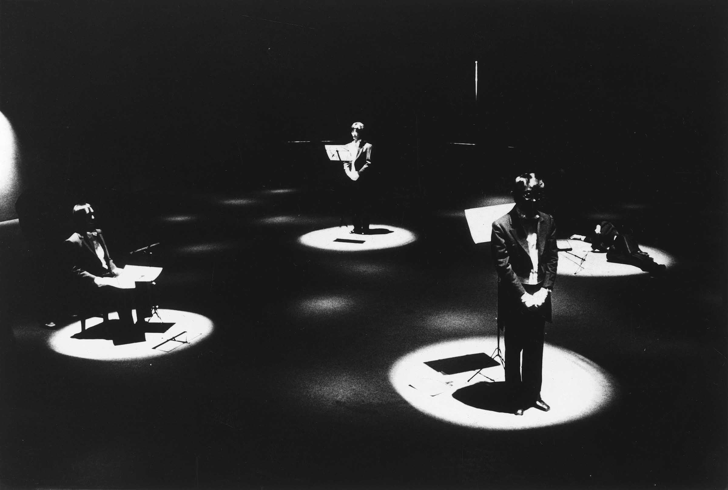 La performance mette in scena quattro personaggi maschili in abito da cerimonia, situati nei quattro punti mediani delle diagonali dell’ambiente e correlati ognuno a un leggio e a un numero progressivo di fotografie che di volta in volta riproducono in sovrapposizione i personaggi successivi. La nota di scena delle quattro situazioni recita come segue: