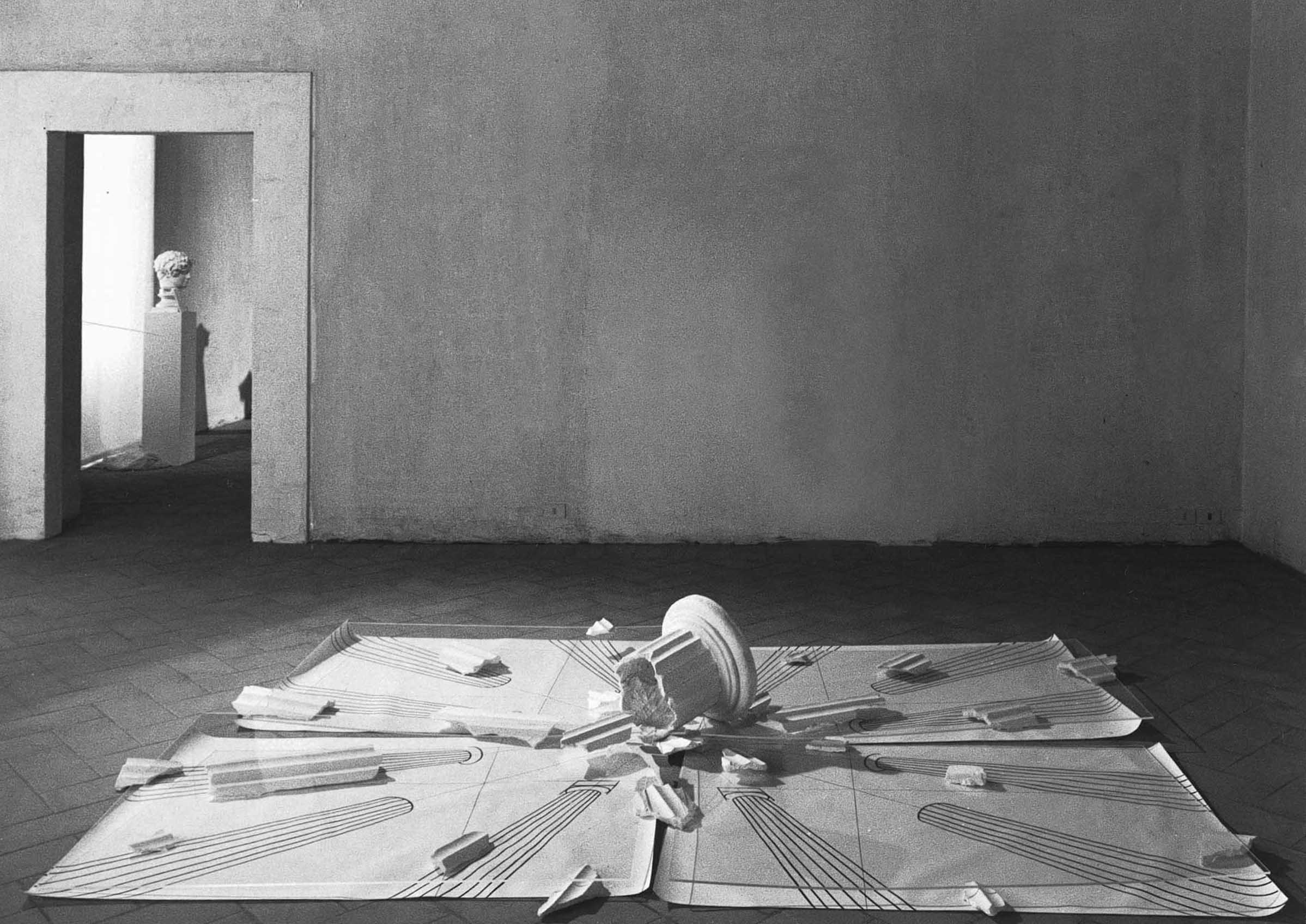 I frammenti del calco in gesso di una colonna scanalata sono sparsi sopra e sotto quattro lastre di plexiglas, che in posizione lievemente sfalsata trattengono quattro ingrandimenti fotografici di un disegno prospettico di colonne, accostati a terra in leggera sovrapposizione. Lungo le diagonali le immagini sono fra loro speculari – il medesimo negativo è stampato due volte diritto e due volte al rovescio – affinché il disegno, a furia di rincorrere un modello inafferrabile, imploda in se stesso.