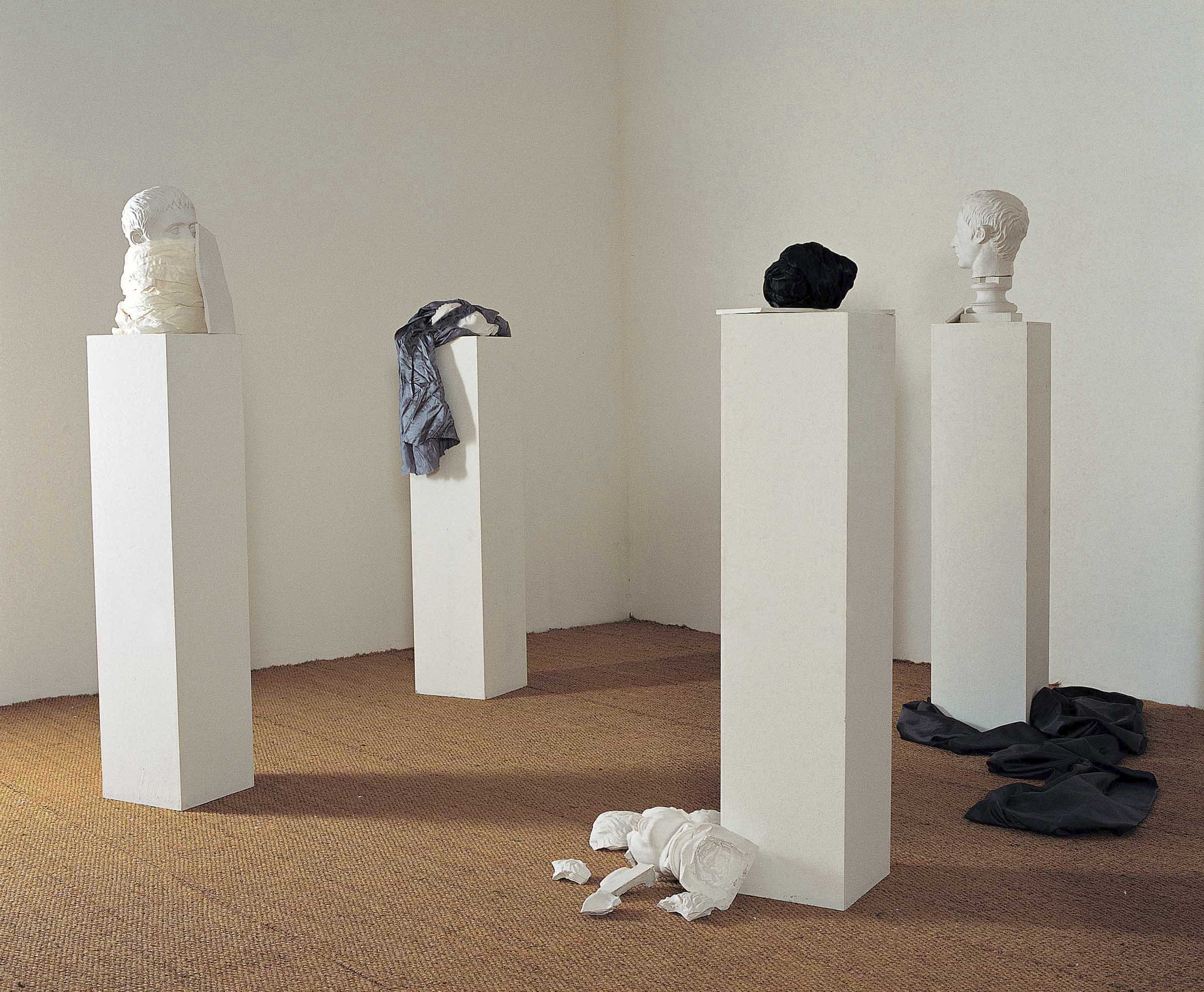 Due calchi di gesso interi e due in frantumi, tessuti, frammenti di tavoletta in gesso incisa, basi bianche