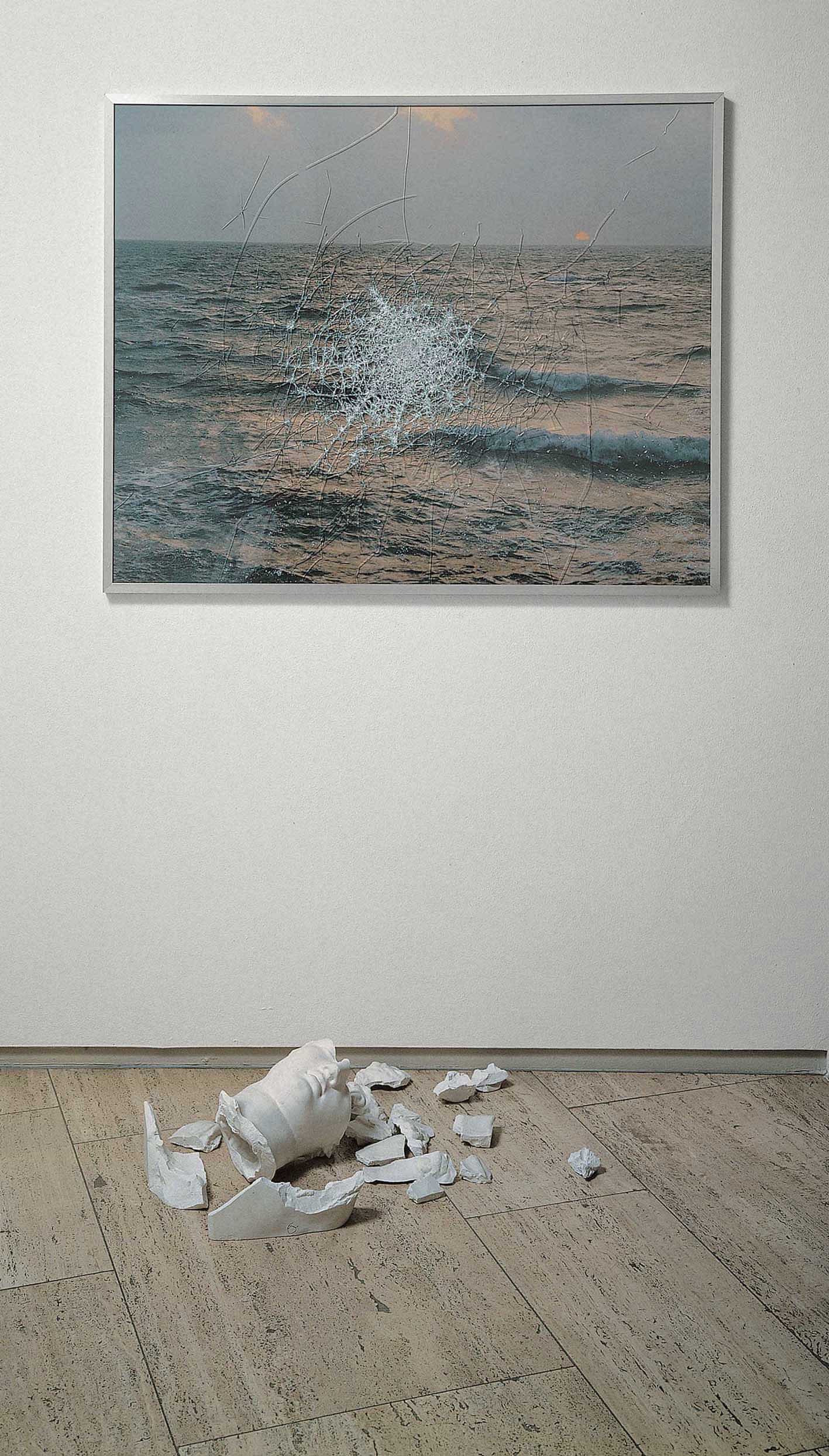 Una fotografia a colori del mare aperto, incorniciata in una cornice di metallo con la lastra di vetro infranta al centro, è associata alla frantumazione di un calco in gesso del busto dell’Hermes di Prassitele, rovinato a terra.