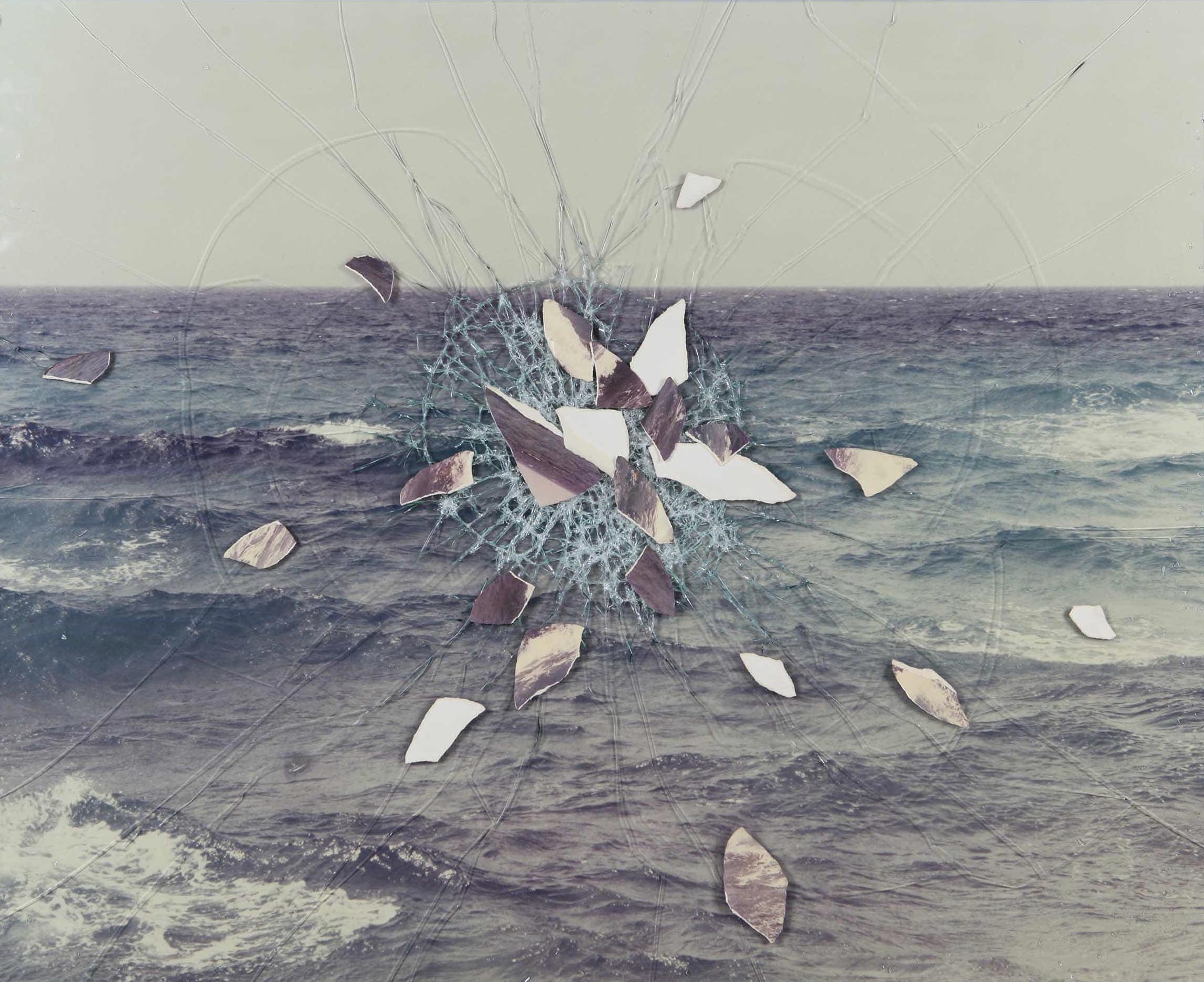 Una fotografia a colori del mare aperto, incorniciata in una cornice di metallo con la lastra di vetro infranta al centro, accoglie i frammenti lacerati di un’altra veduta marina, in parte rovesciati, che dall’epicentro della frantumazione si disperdono gradualmente verso l’esterno.