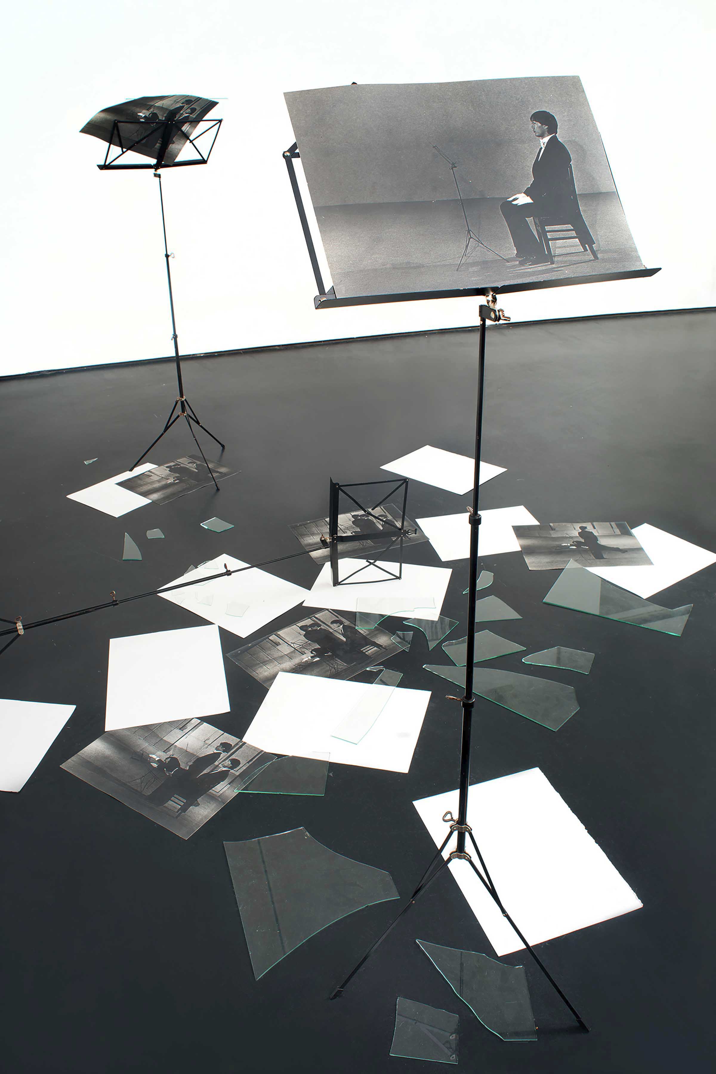 Quattro leggii con orientamenti diversi (uno è disteso a terra) e uno sgabello segnano i vertici dell’area occupata al suolo da diciassette fogli bianchi e fotografie in bianco e nero (alcune sono capovolte), sparpagliati in ordine sparso. Sui leggii si trovano altre fotografie trattenute da una lastra di vetro; i frammenti della quarta lastra sono disseminati a terra, in analogia al leggio caduto.