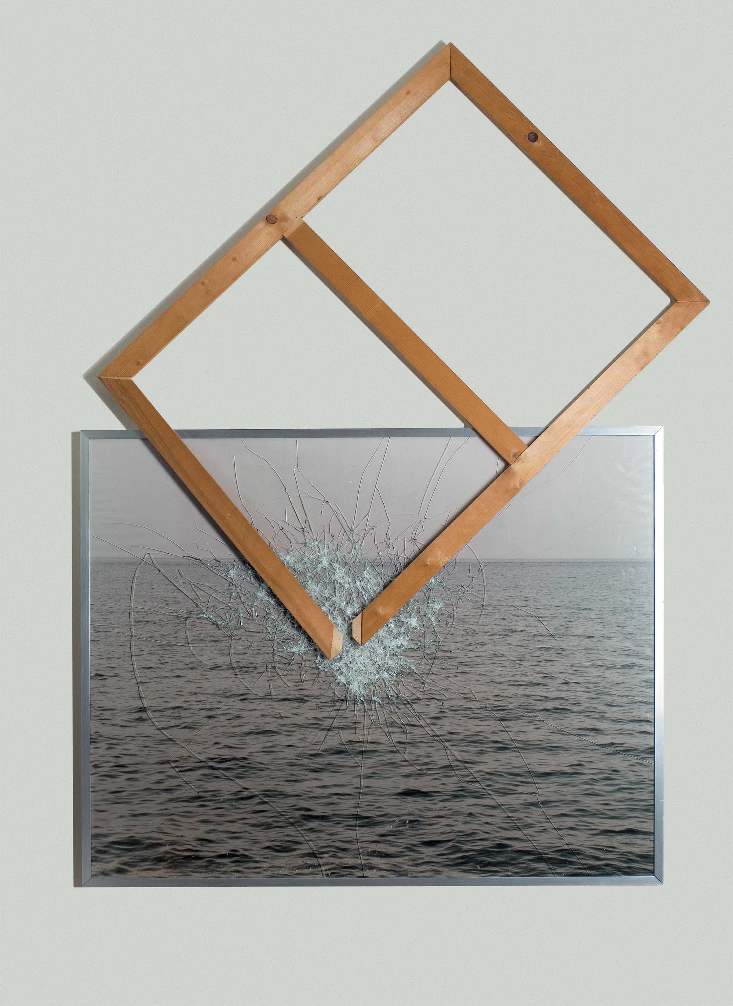 Una fotografia a colori del mare aperto, incorniciata in una cornice di metallo con la lastra di vetro infranta al centro, è associata a un telaio sospeso alla parete in posizione inclinata, in modo che l’angolo inferiore sinistro coincida con l’epicentro della frantumazione.