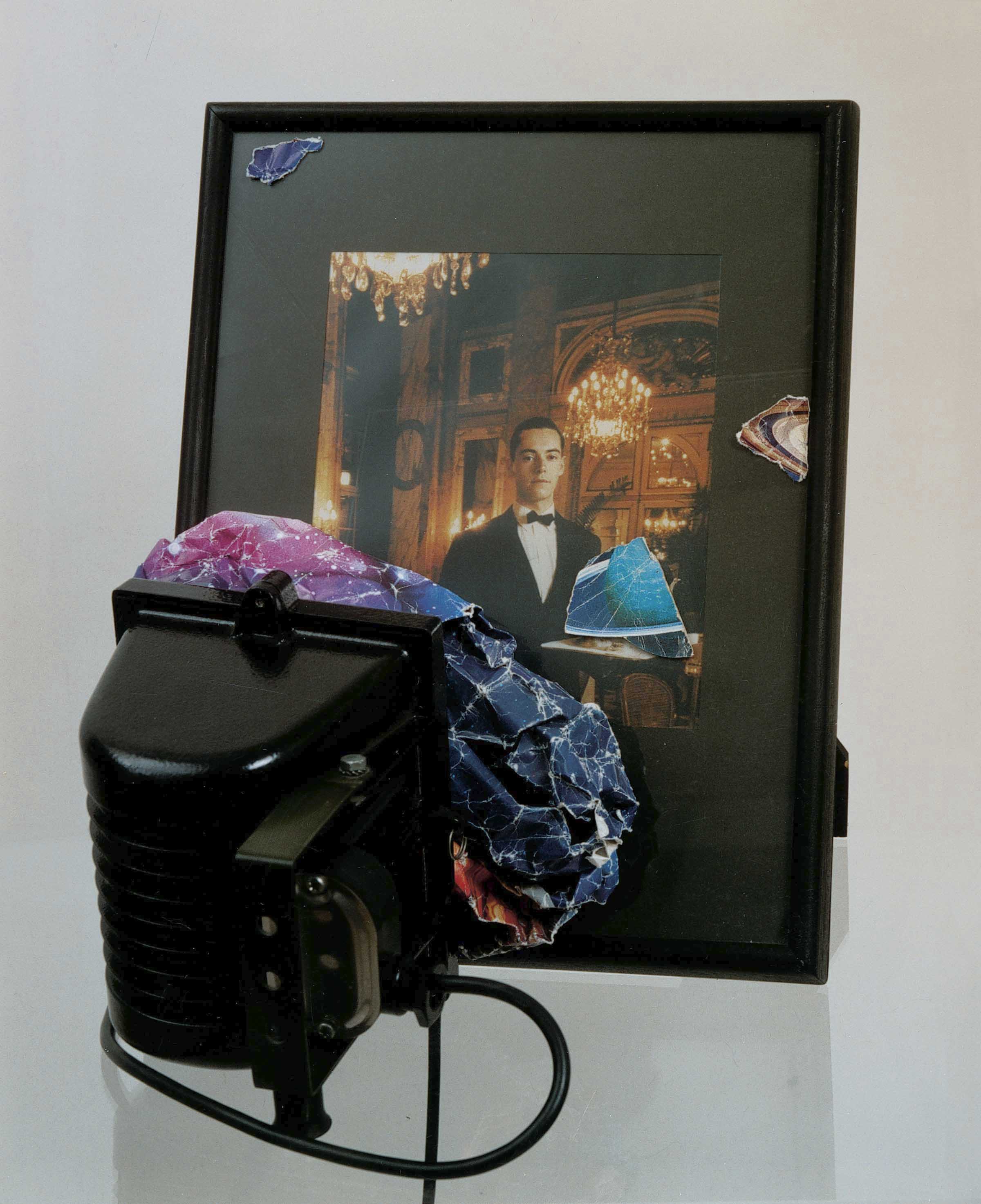 Stampa fotografica a colori in portaritratti, lampada alogena, collage su vetro, riproduzione fotografica accartocciata