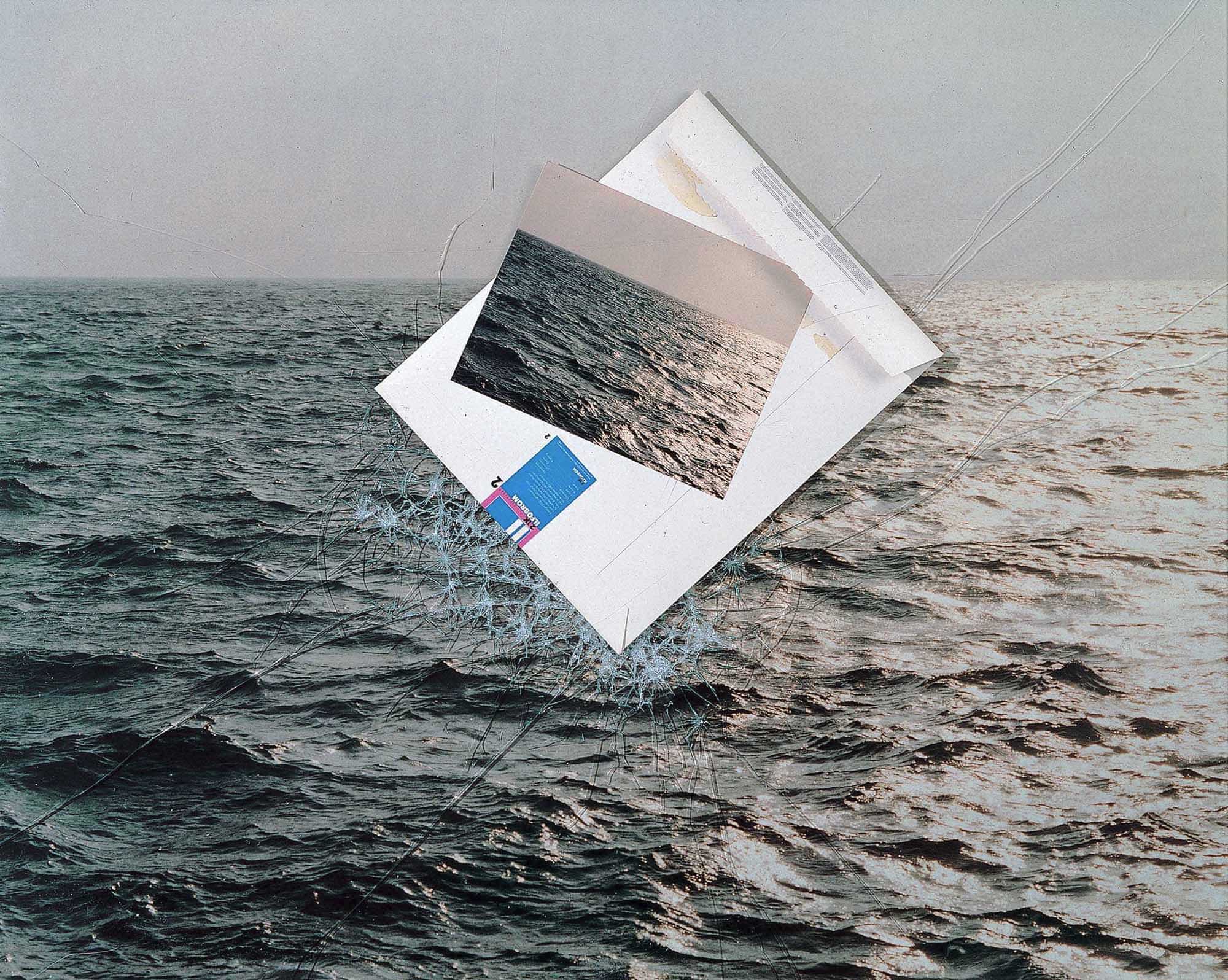 Una fotografia a colori del mare aperto, incorniciata in una cornice di metallo con la lastra di vetro infranta al centro, accoglie una copia più piccola della stessa fotografia, sovrapposta alla busta cartonata che la conteneva.