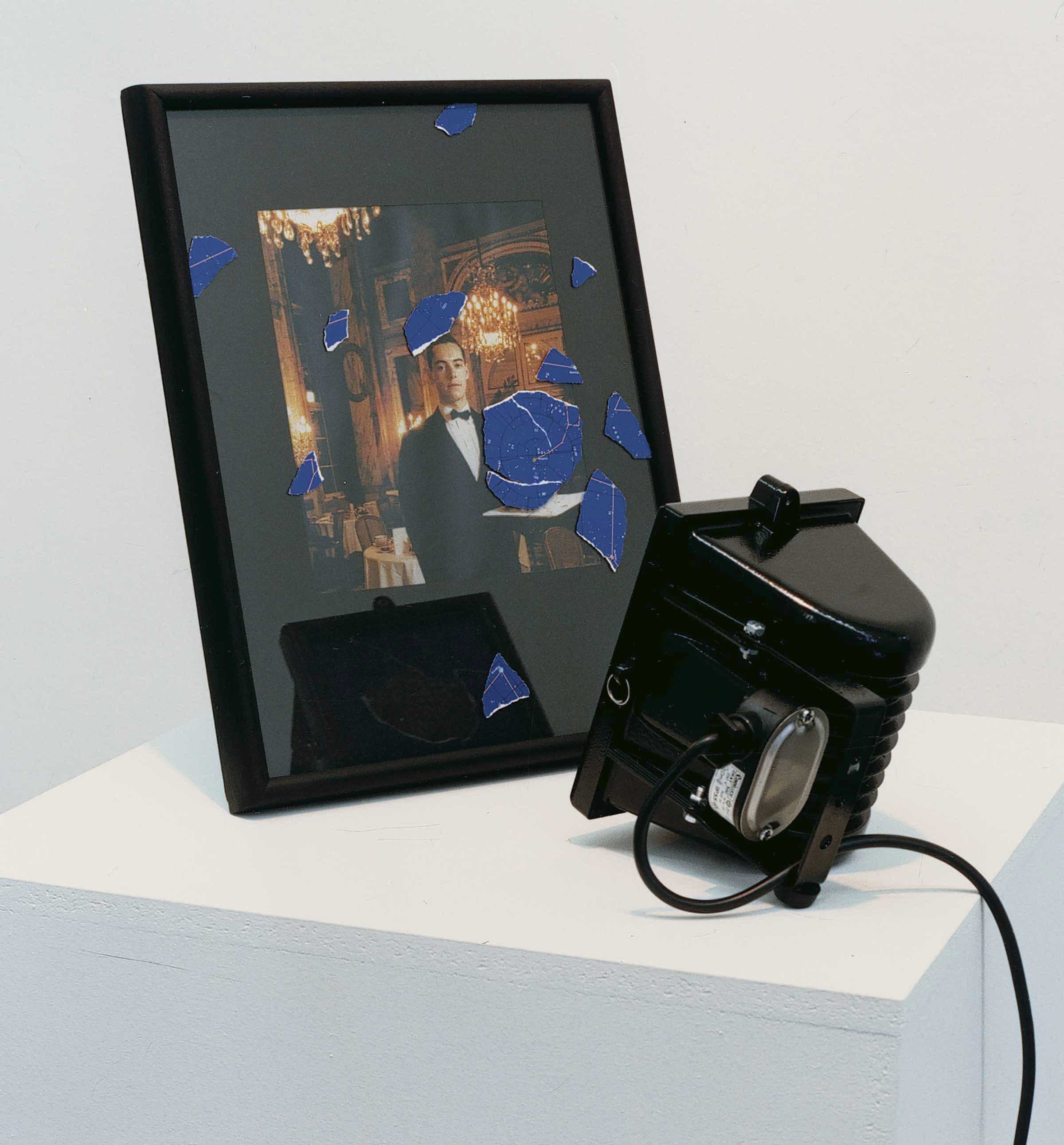 Un portaritratti con passe-partout nero, collocato di fronte a una lampada alogena spenta, incornicia la riproduzione fotografica a colori di un cameriere, ripreso sullo sfondo di un interno di Grand Hotel rischiarato da sfavillanti lampadari di cristallo. Sul vetro del portaritratti, sono sparsi dei frammenti lacerati di una carta stellare, con il frammento principale in corrispondenza del vassoio tenuto dal cameriere. Sul vetro della lampada si trovano invece altri particolari della medesima fonte iconografica, disposti tutt’intorno alla parte centrale come se l’immagine fosse stata “consumata” in quel punto.