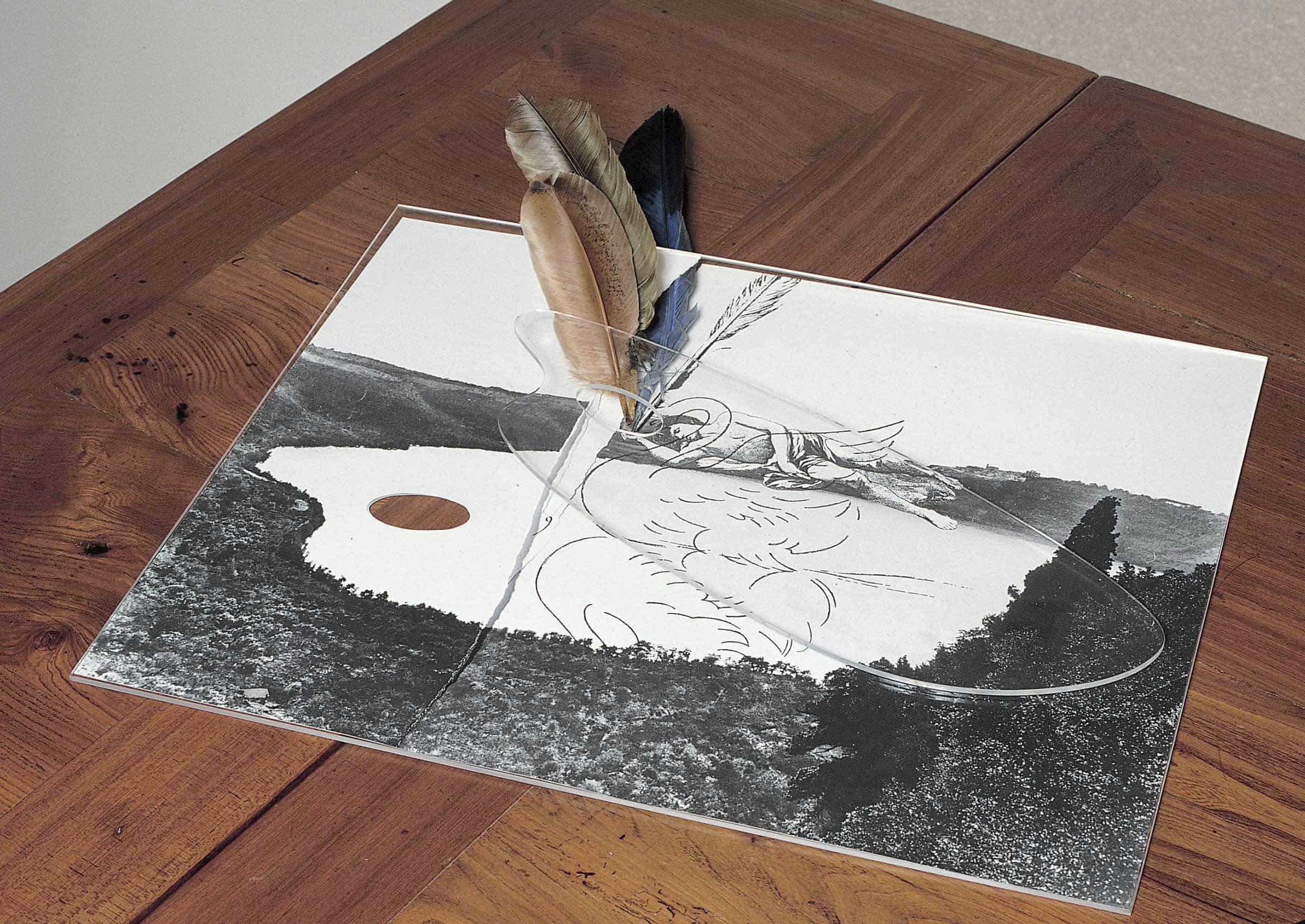 Una fotografia del collage dell’artista intitolato L’exil du cygne (1982-83, GPC-0638) è trattenuta da una sagoma ovale di plexiglas, posata di traverso sull’immagine e dotata di un ritaglio, in modo da fare eco al lago-tavolozza riprodotto nell’immagine. Nel foro della lastra ovale sono inserite alcune piume variopinte, che si richiamano alla piuma-penna presente nel collage.