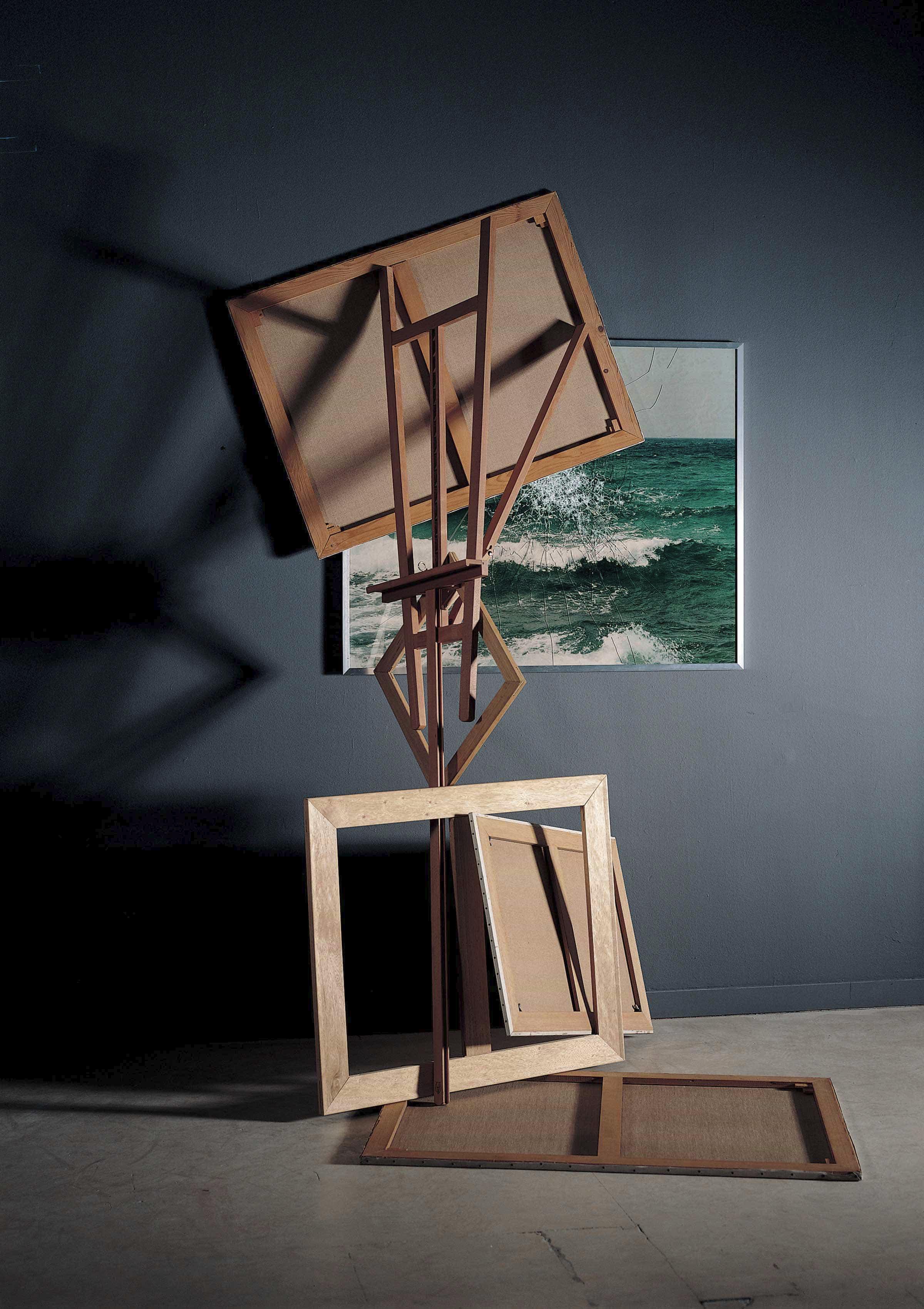 Una fotografia a colori del mare aperto, incorniciata in una cornice di metallo con la lastra di vetro infranta al centro, è posta in relazione con un assemblaggio di tele e telai, disposti intorno a un cavalletto capovolto che funge da perno statico della composizione in equilibrio precario. Una tela rovesciata è trattenuta in posizione leggermente inclinata contro la parte superiore della fotografia, un’altra è distesa a terra a contatto con la punta del cavalletto, una terza tela è incastrata nel telaio inserito nell'asta, mentre un secondo telaio, più piccolo, è sospeso a losanga all'altezza della mensola del cavalletto.