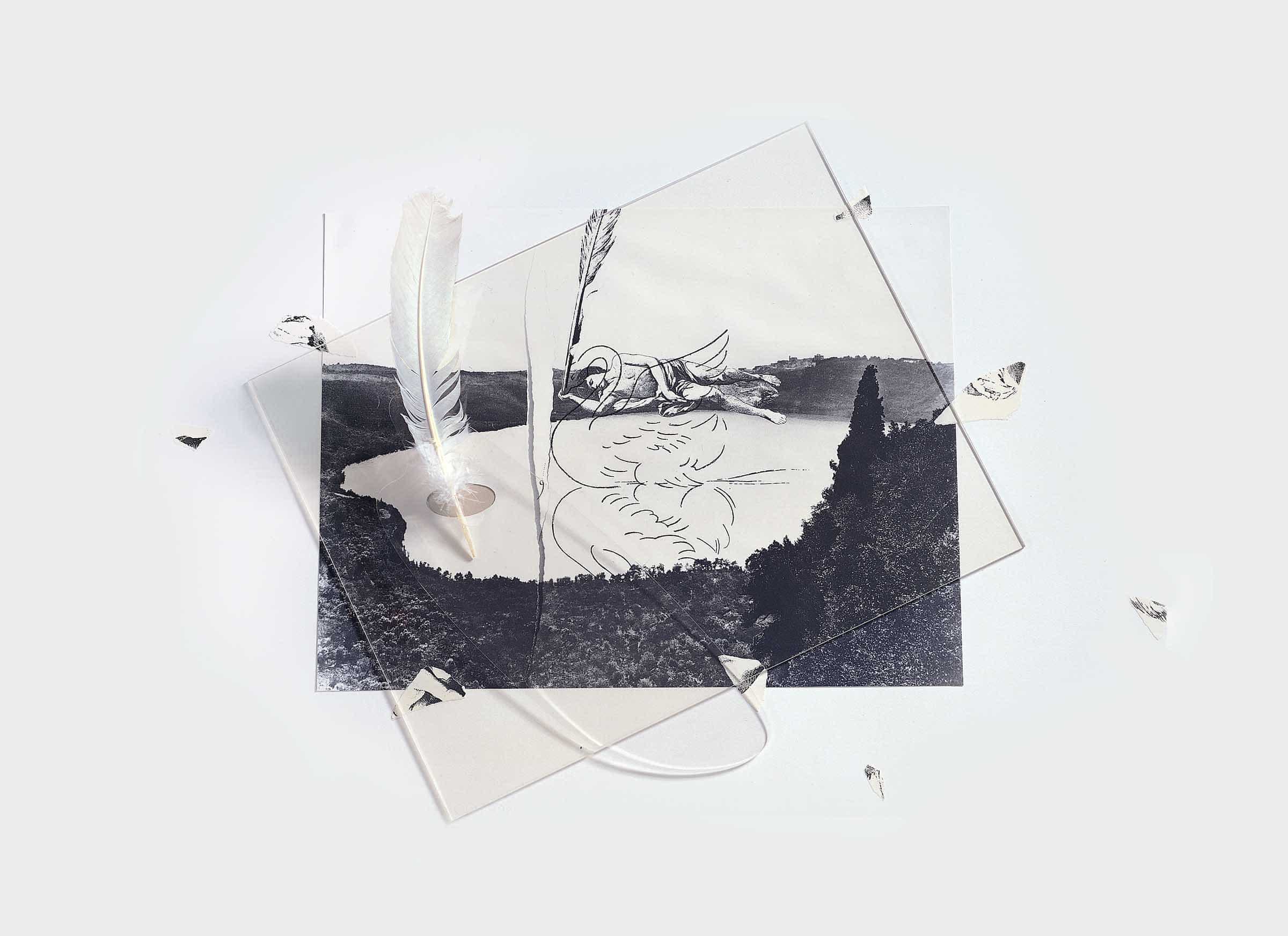 Una fotografia del collage dell’artista intitolato L’exil du cygne (1982-83, GPC-0638), trattenuta al centro di un foglio più grande da alcuni frammenti lacerati di un disegno antico, accoglie una lastra di plexiglas squadrata, collocata di traverso, e una sagoma ovale di plexiglas dotata di un ritaglio, collocata in modo che il suo foro coincida con quello fotografico del lago-tavolozza riprodotto nell’immagine. Nel foro della sagoma ovale è inserita una piuma bianca, che richiama quella presente nel collage.