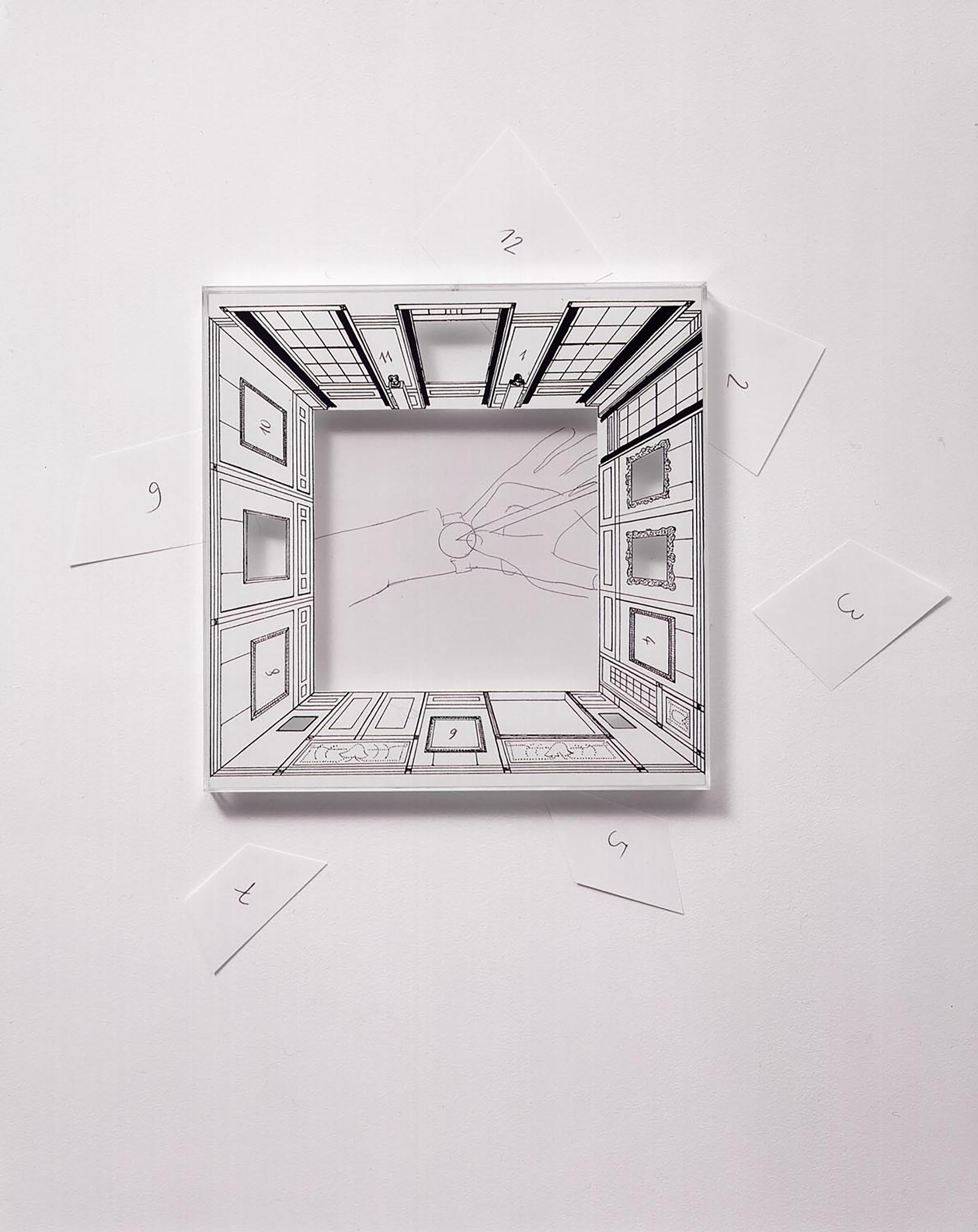 L’immagine nella teca di plexiglas, rifilata a passe-partout, riproduce il disegno di una stanza vista dall’alto con dodici (ri)quadri, sei dei quali sono ritagliati e lasciano intravedere porzioni di muro. In corrispondenza del vano centrale della teca è applicata sulla parete la riproduzione fotostatica del disegno di una mano intenta a indicare con la punta di una matita il centro dell’orologio al polso dell’altra mano. L’orologio determina la numerazione in senso orario da 1 a 12, iscritta a matita sui quadri della stanza virtuale oppure, laddove il numero cade in corrispondenza di un riquadro ritagliato, sugli elementi di carta bianca sparsi sulla parete (il formato trapezoidale e le dimensioni osservano le regole della vertiginosa visione dall’alto).
