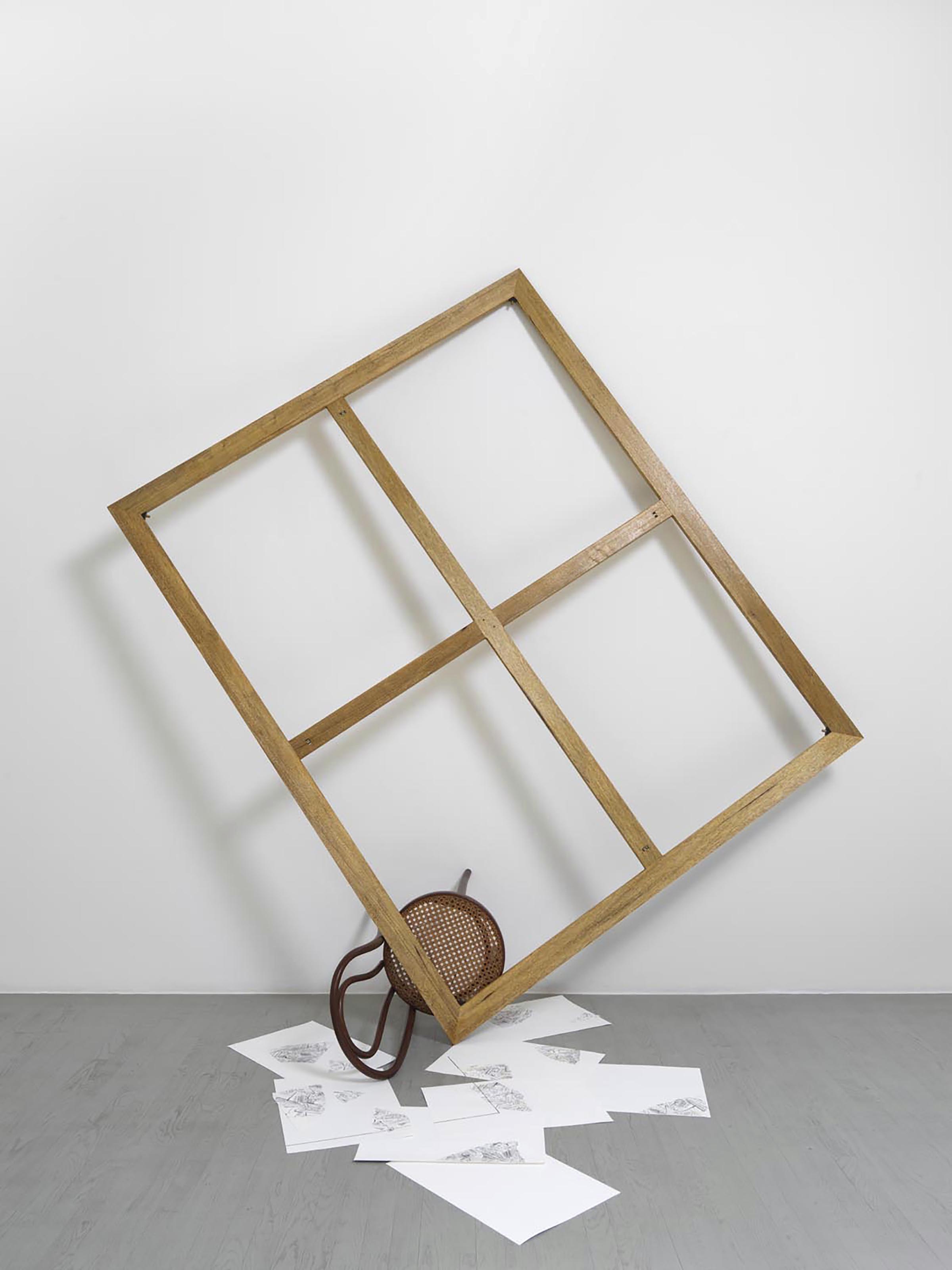 Un telaio in equilibrio precario è abbinato a una sedia Thonet rovesciata a terra e ad alcuni fogli allestiti in ordine sparso sul pavimento. Nell’area centrale, un tracciato a matita delinea sui fogli il profilo di un quadrilatero, corrispondente nelle misure a uno scomparto del telaio. I fogli recano dei frammenti di un’immagine lacerata di scritture dell’artista1.