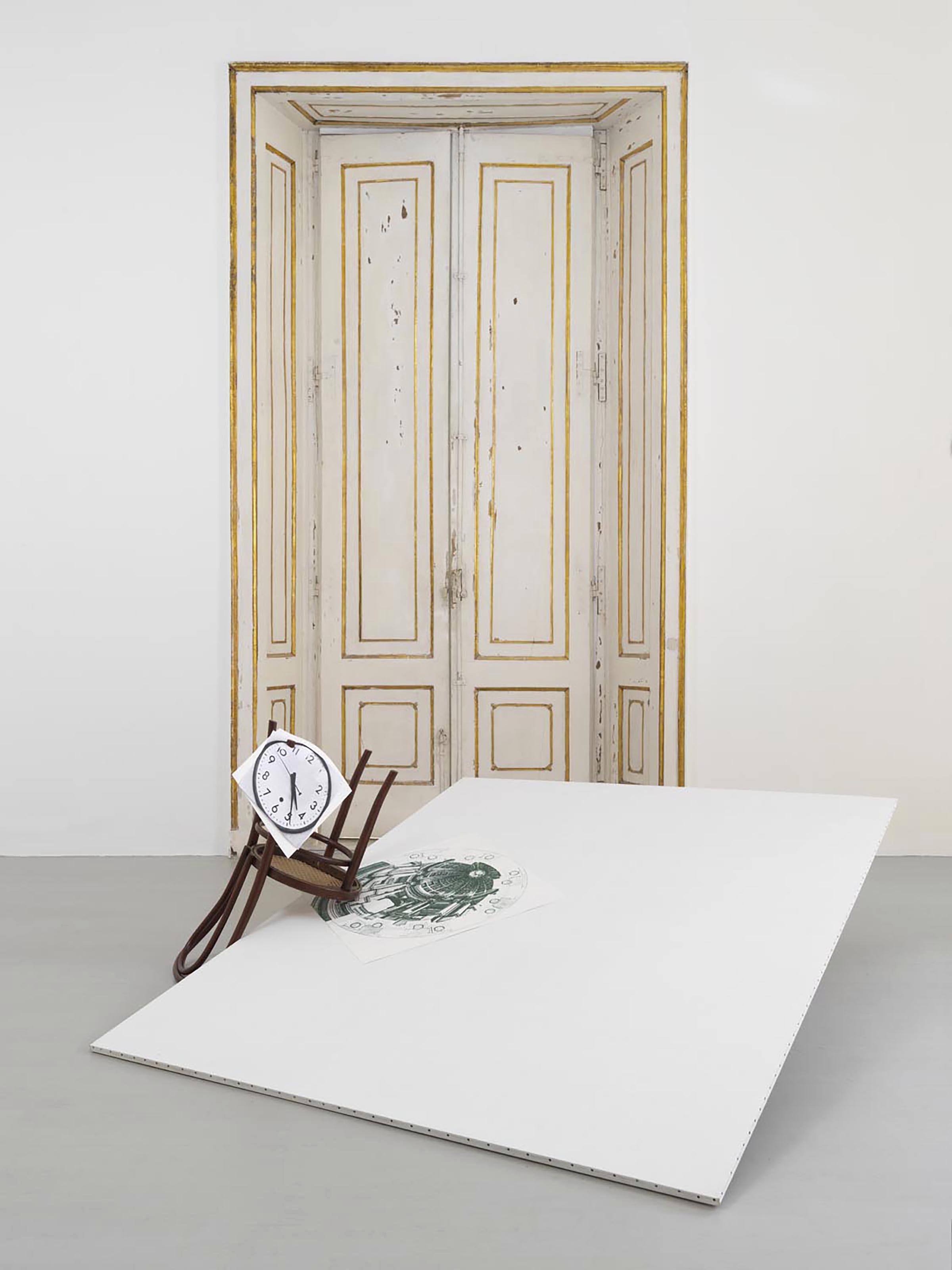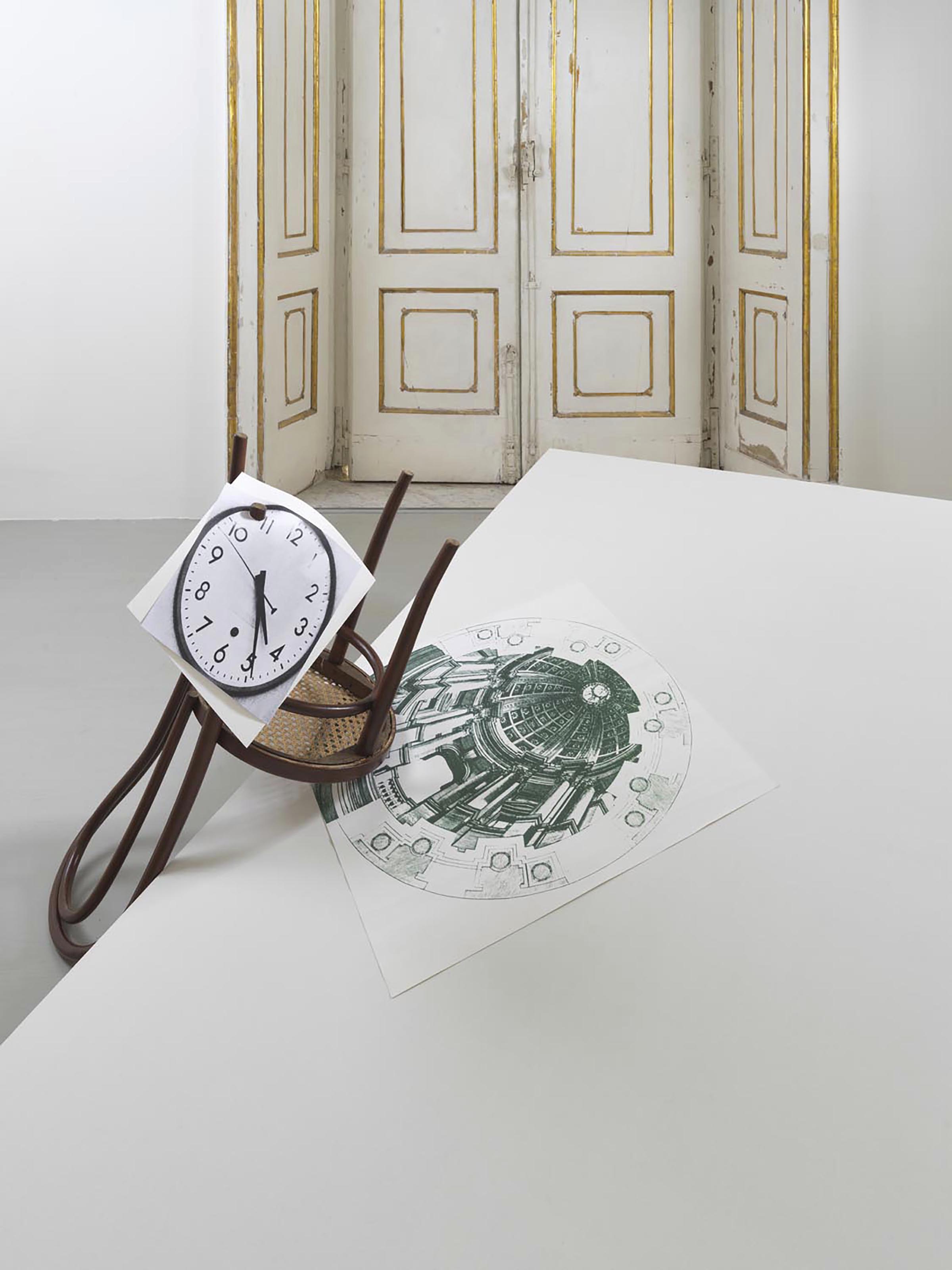Una tela preparata è coricata al suolo, in posizione inclinata, tra due sedie Thonet capovolte: l’una è riversa sopra il lato sinistro della tela, l’altra seminascosta sotto l’estremità opposta. La sedia a vista trattiene tre elementi cartacei: un foglio bianco e l’immagine di un quadrante di orologio, inseriti in una delle gambe della seduta, e il disegno settecentesco di una cupola in prospettiva di sotto in su, posata sulla tela.