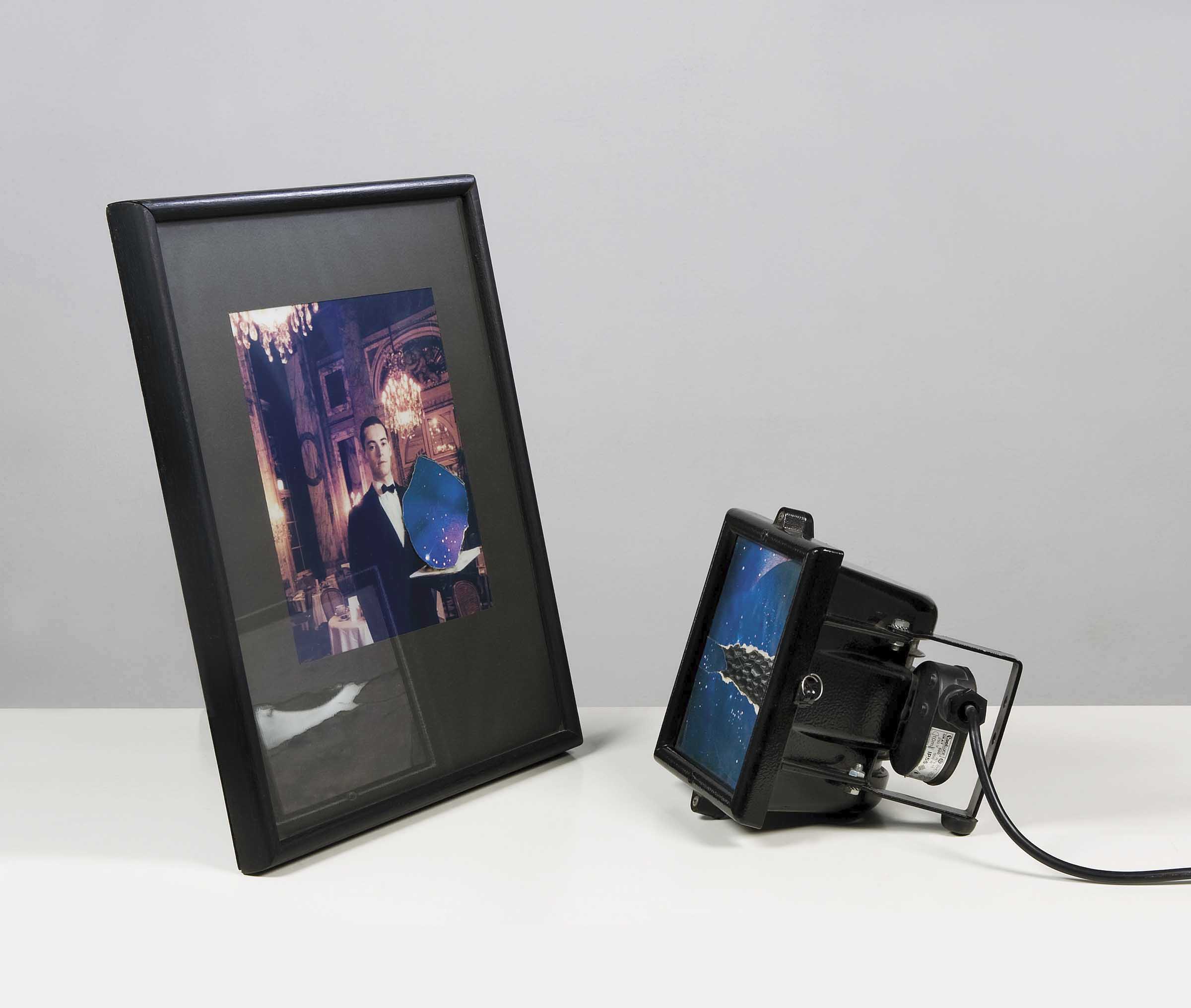 Un portaritratti con passe-partout nero, collocato di fronte a una lampada alogena spenta, incornicia la riproduzione fotografica a colori di un cameriere, ripreso sullo sfondo di un interno di Grand Hotel rischiarato da sfavillanti lampadari di cristallo. Sul vetro del portaritratti, in corrispondenza del vassoio, come fosse l’”offerta” servita dal cameriere, è applicata l’immagine lacerata di una nebulosa galattica. Sul vetro della lampada si intravede invece la parte restante dell’immagine da cui quel frammento è stato strappato, come a suggerire la fatale “consumazione” dell’immagine nel momento in cui fosse illuminata dalla lampada accesa.